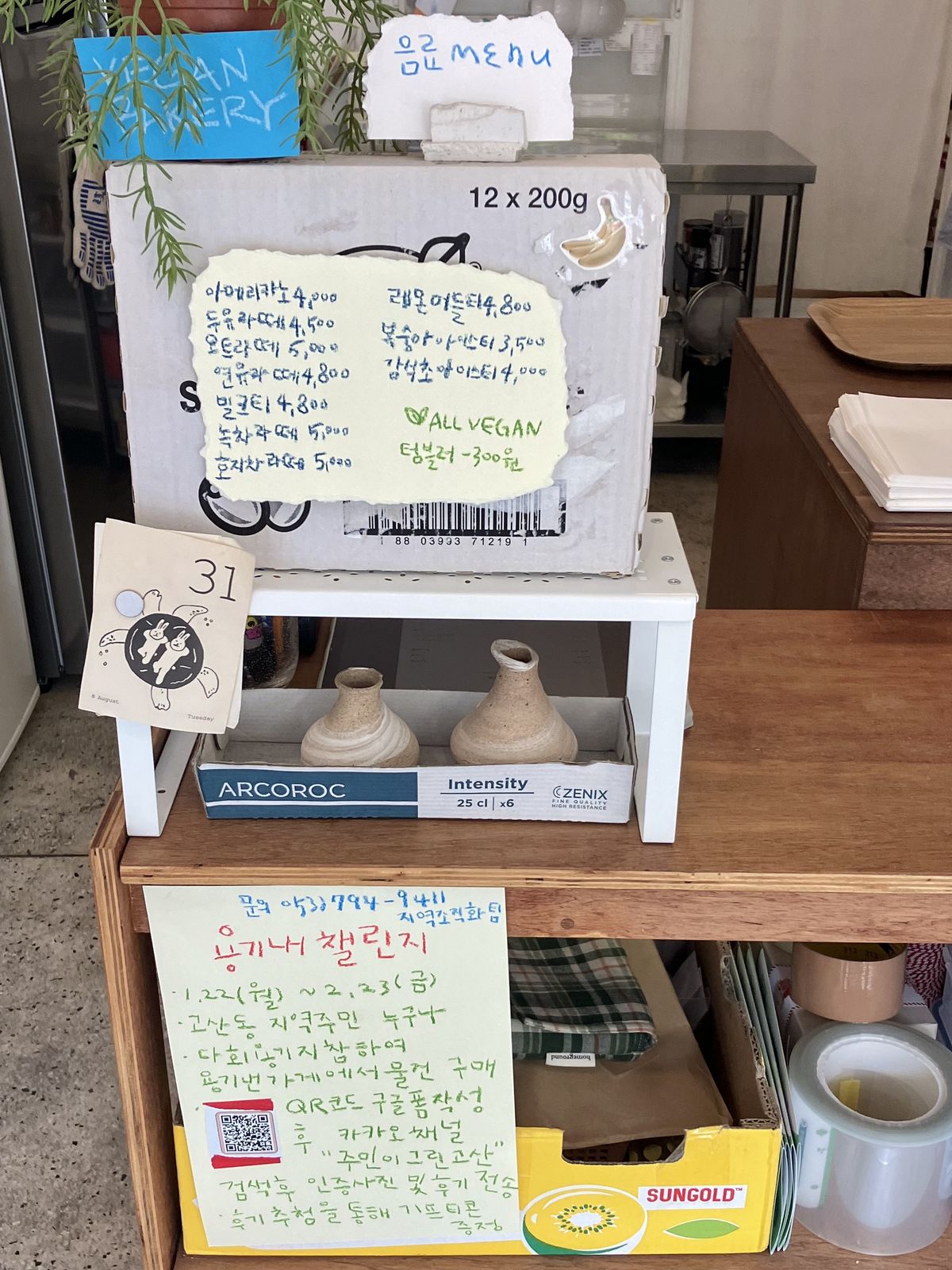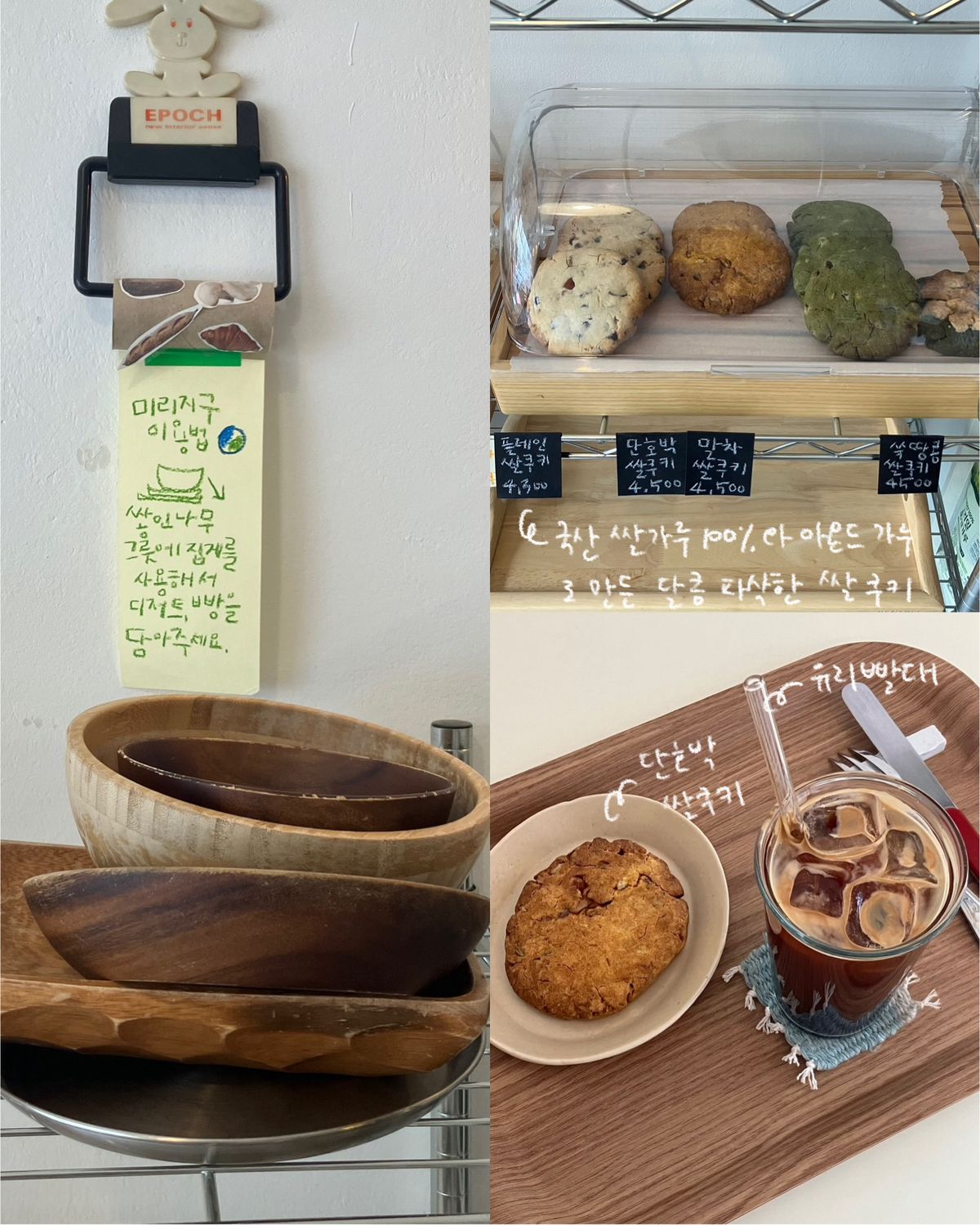 식물성 재료를 사용해 빵과 디저트를 만드는 곳이다. 그러나 우유, 버터, 계란을 사용하지 않는 흔한 비건 카페가 아니다. 테이블과 의자는 중고 가구이며 휴지나 물티슈 대신 순면 티슈를 재사용한다. 텀블러나 용기를 이용하면 300원 할인 혜택을 제공하며 텀블러를 지참하지 못한 이들에겐 다회용기를 무료로 빌려준다. 환경에 이로운 방향을 제시하는 세심한 배려를 느낄 수 있다.