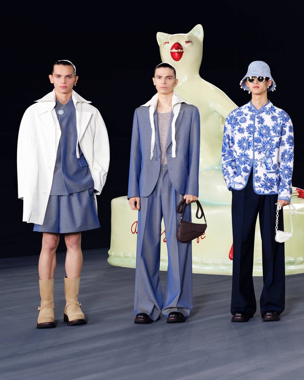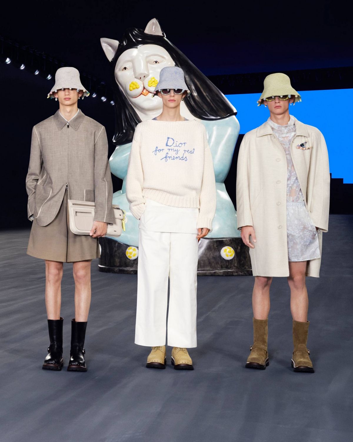 런웨이 위 거대 고양이 조형물이 가득한 이곳은? 바로 도예가 힐튼넬과 협업한 디올의 쇼장. 귀여운 디테일로 가득한 에스닉한 룩이 대거 등장한 이번 쇼에는 브랜드 엠배서더 차은우와 TXT 멤버들이 자리를 빛냈다.