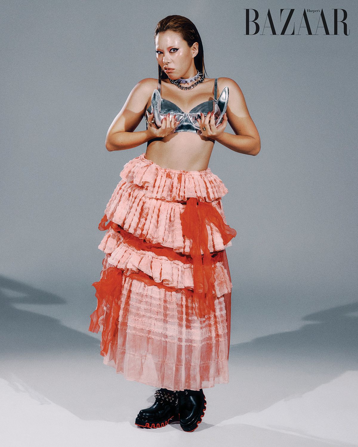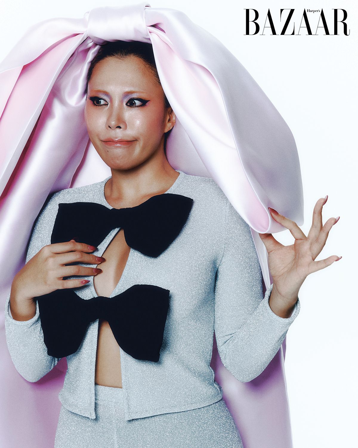 퀸가비 한국에서는 첫 화보인데 일단 <바자>가 엄청 신경 써준 것 같아서 감동했다고 얘기하고 싶어요. 사실 지금까지는 하이패션 오트 쿠튀르 화보를 찍었죠. 그런데 오늘은 갑자기 요란한 옷들을 입히고 특이한 포즈를 요청하셔서 살짝 당황했다, 하지만 그래도 좋은 추억이었다고 얘기하고 싶어요. Thank you.