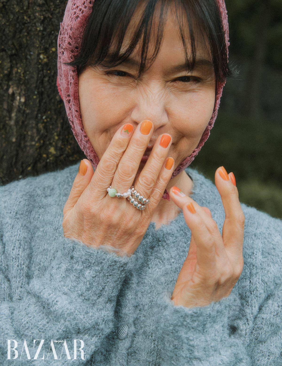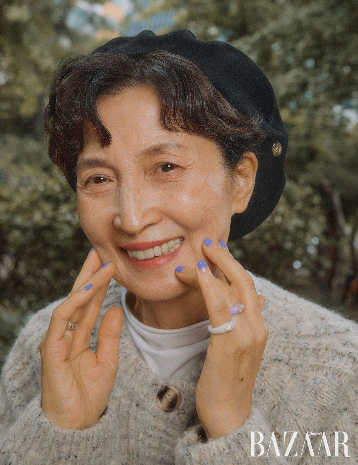 베레는 Helen Kaminski. 컬러 레진 반지, 실버 반지는 Nff. 카디건은 스타일리스트 소장품. 티셔츠는 모델 소장품.