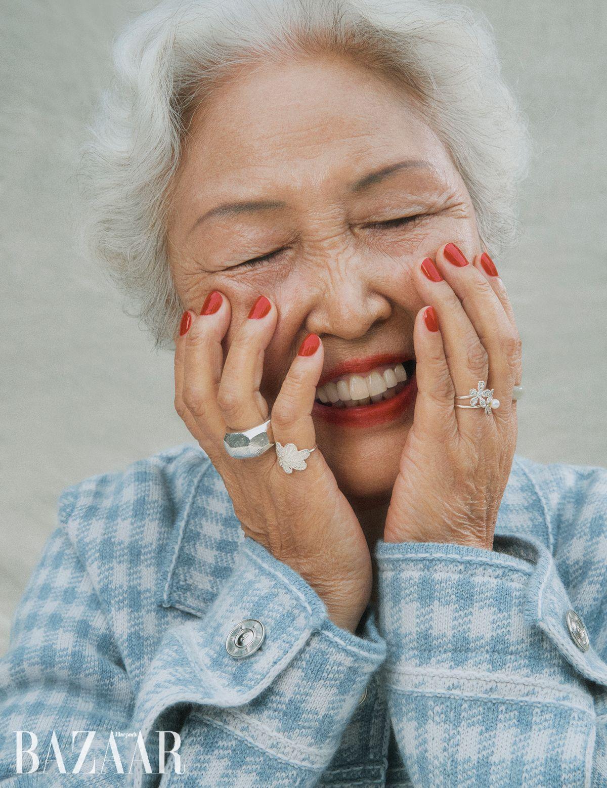 재킷은 Barrie. 실버 반지, 데이지 반지는 모두 Elyona. 옥 반지는 스타일리스트 소장품.