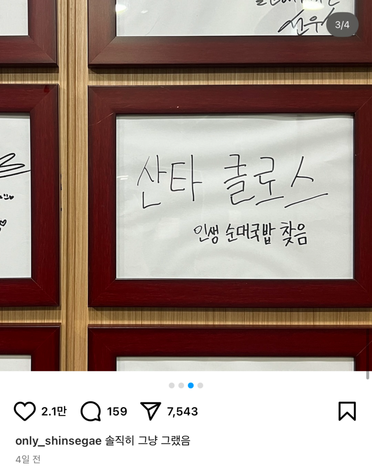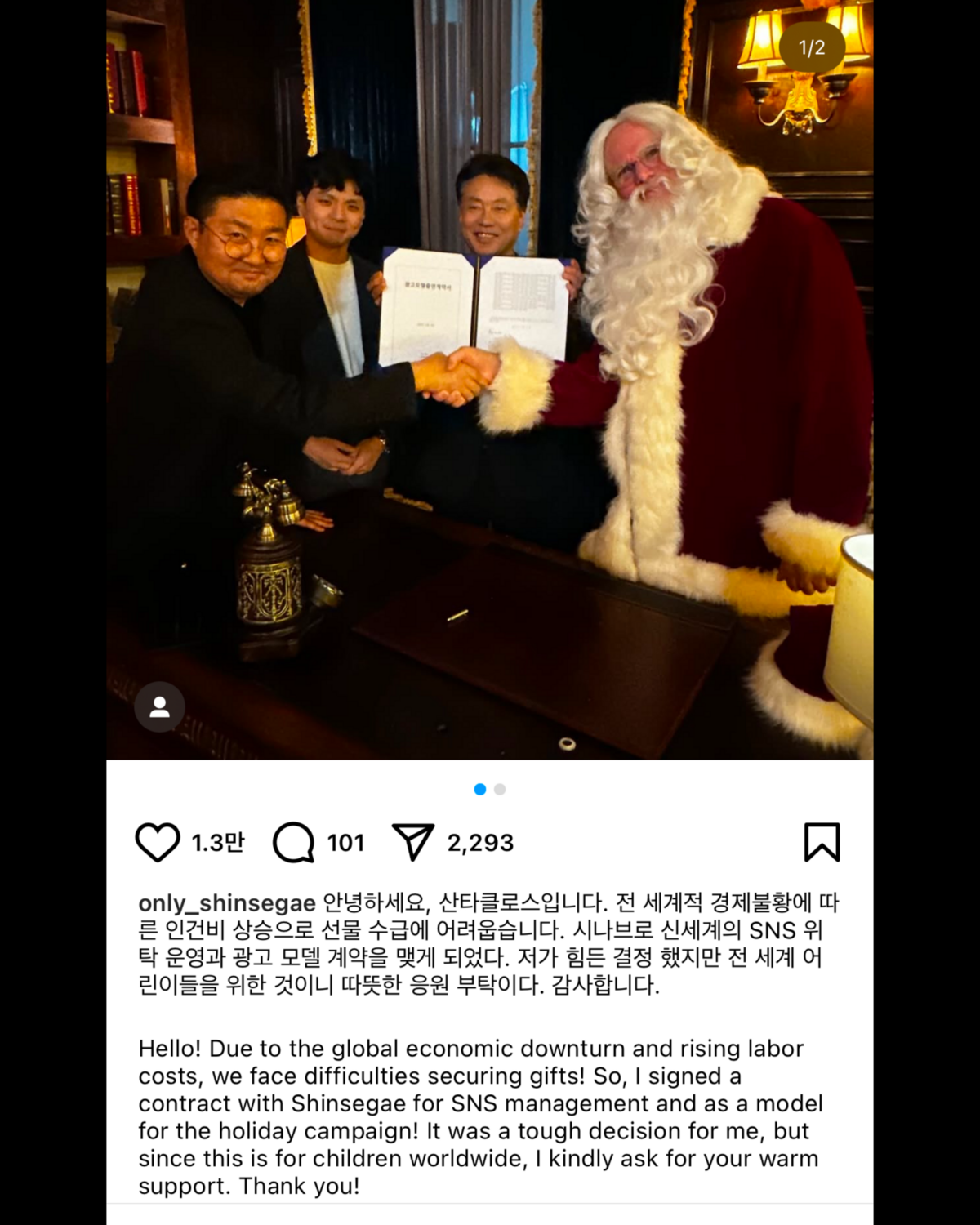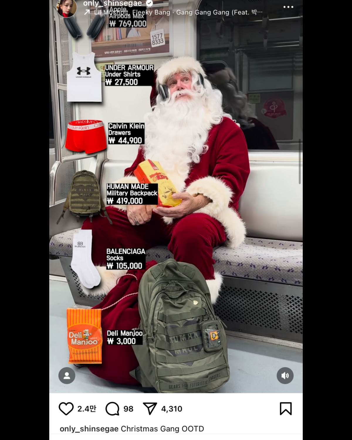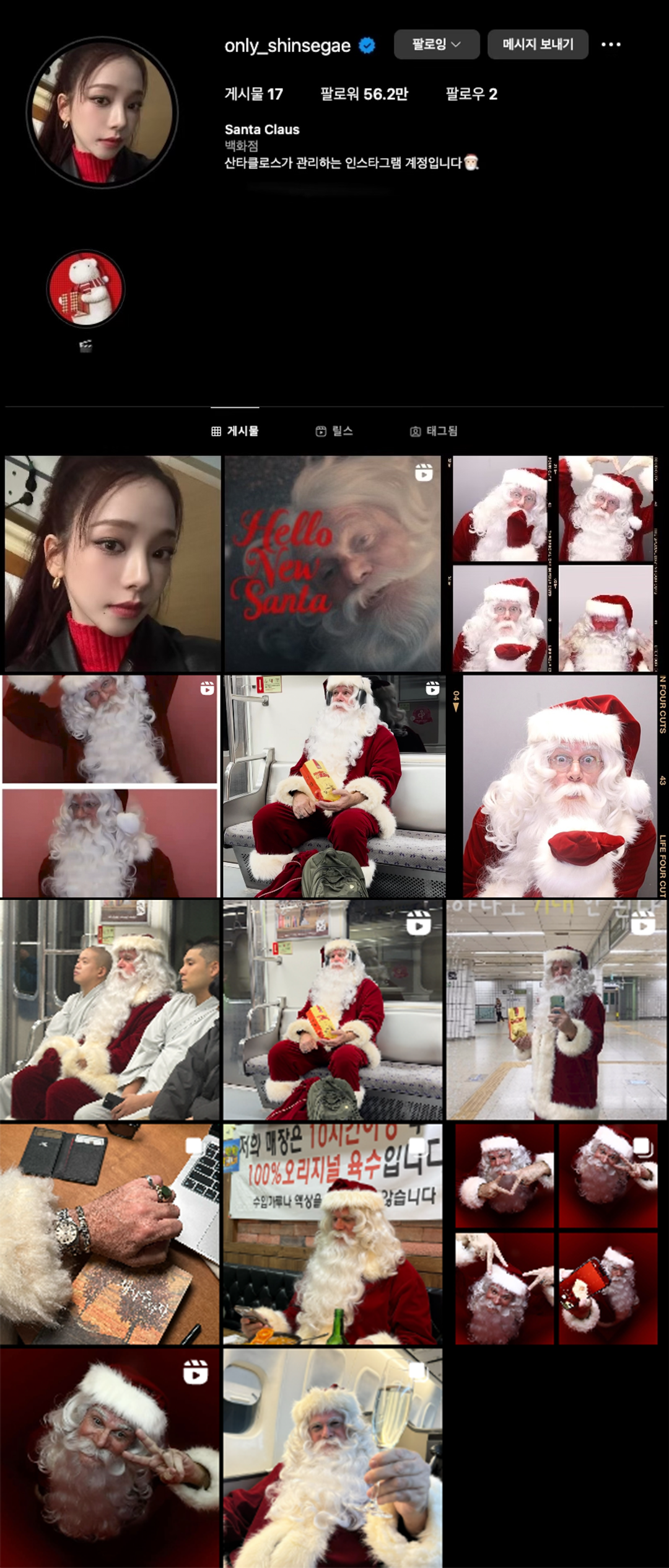 지난 11월 26일 해킹(?)된 신세계백화점 공식 인스타그램 피드가 기존에 있던 게시물이 모두 사라지고 산타클로스의 모습으로 도배되었다. 피드를 점령했다고 밝힌 산타는 팔로워들과 소통하며 지하철도 타고, 순댓국 맛집도 찾아다니며 한국의 전통문화 체험 '인생네컷'까지 야무지게 찍기도. 심지어 신세계 계열사 계정을 모두 팔로우 취소하고, 현대백화점과 롯데백화점 공식 계정만을 팔로우하며 그만의 경고를 남기기도 했다.