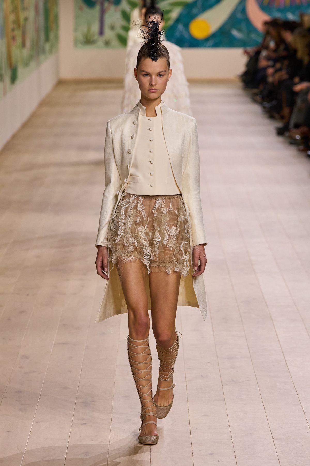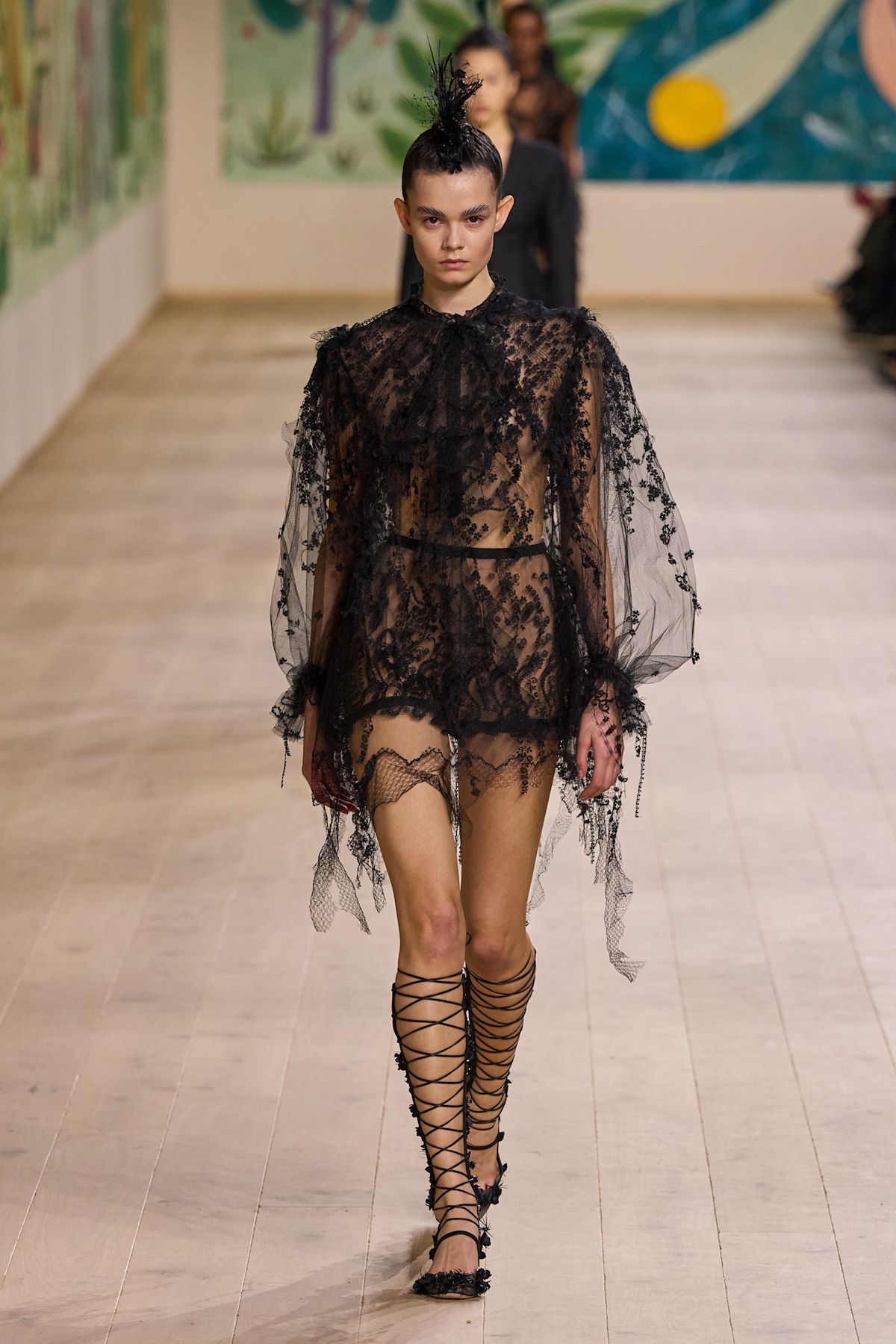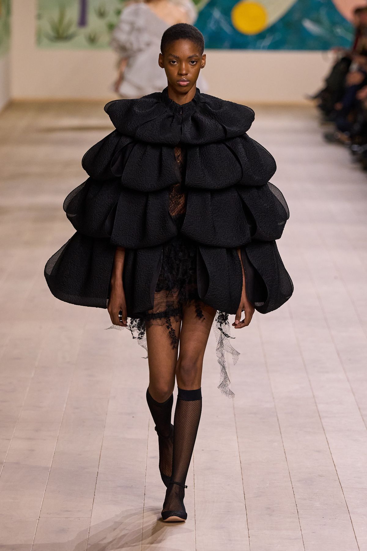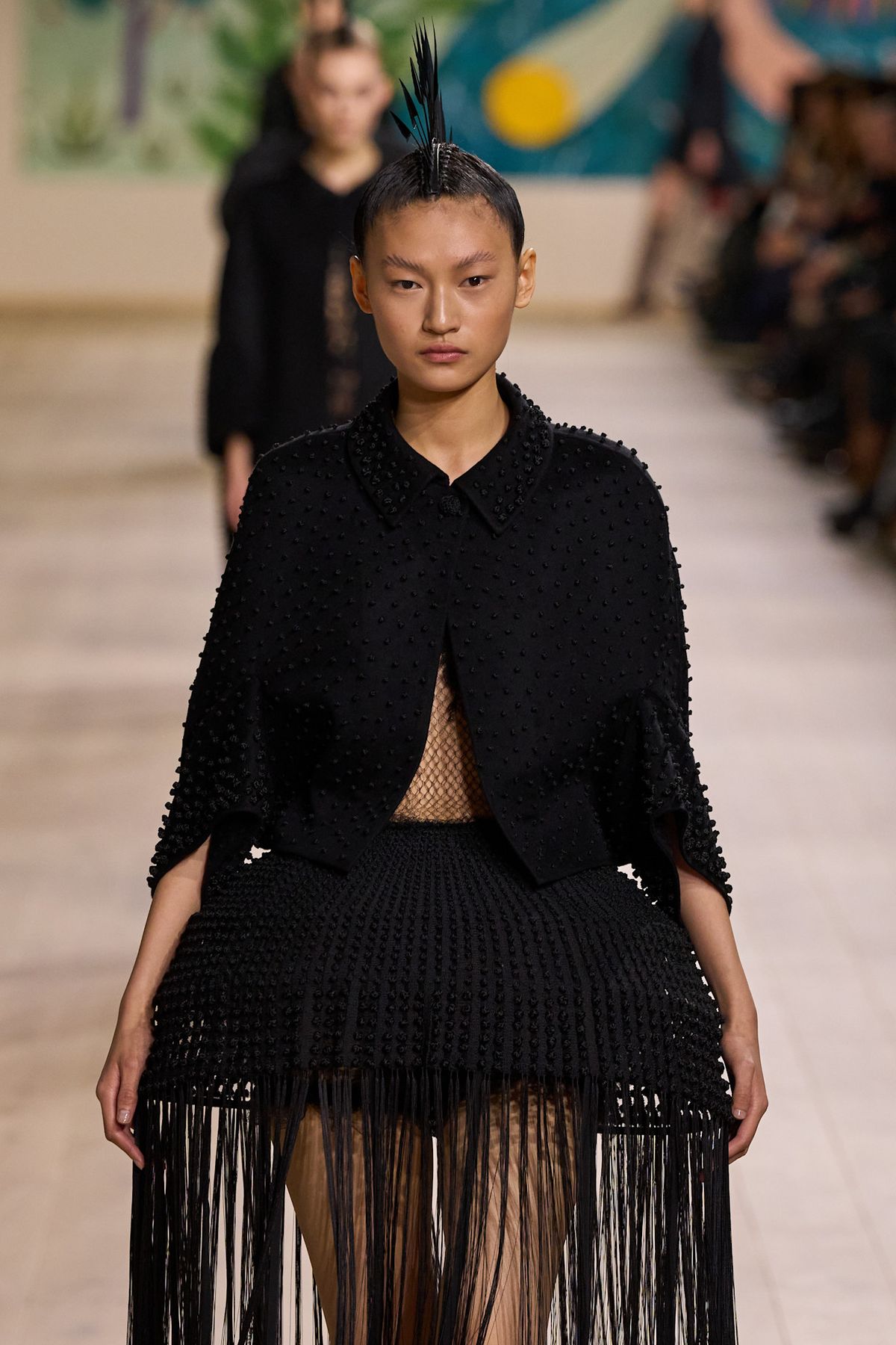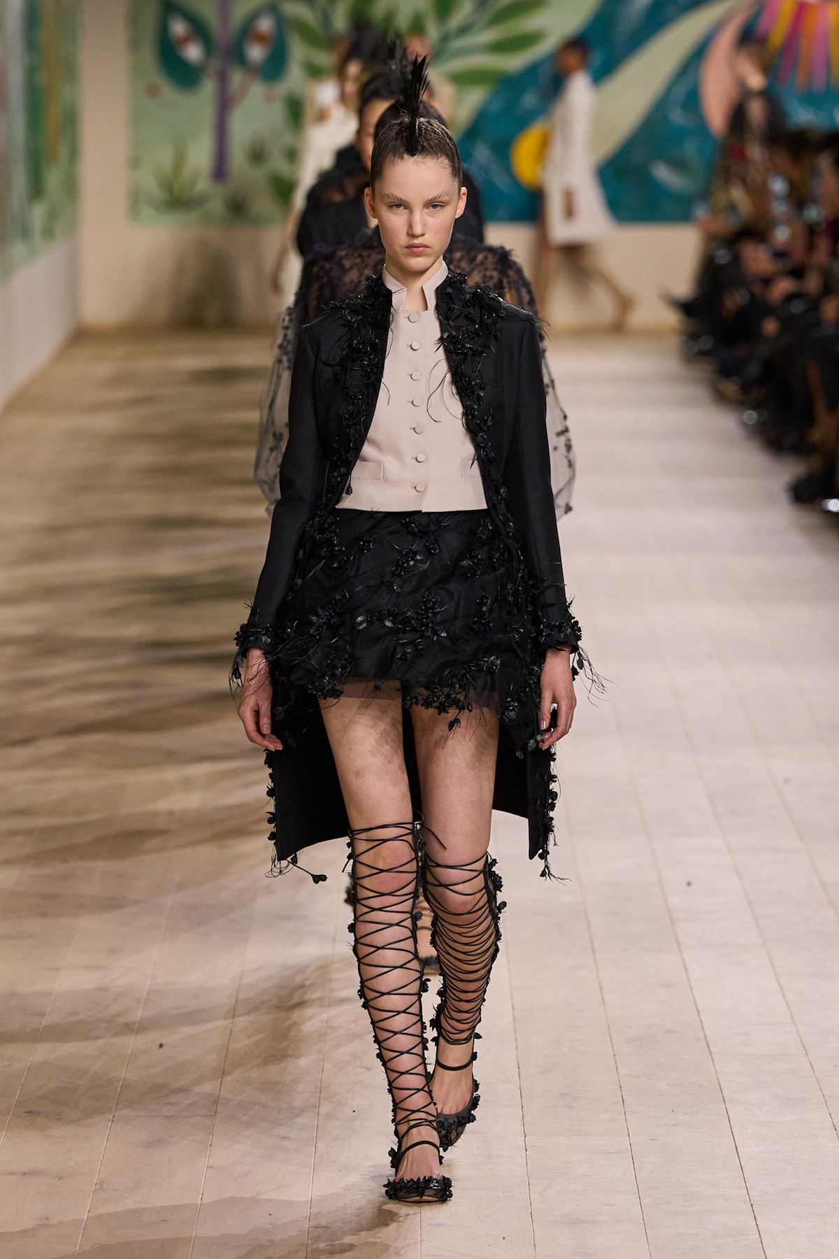 치우리는 18-19세기의 역사적인 패션을 깊이 탐구했는데, 그 중에서도 스커트 안에 착용하던 크레놀린을 집중적으로 연구했다. 런웨이 위 모델들은 펑키한 모히칸 스타일의 헤어를 하고, 정교하게 비즈 장식이 수놓아진 가운과 코트를 입고 있었으며, 프린지 디테일의 스커트는 여성스러움을 더했다. 마치 요정같았다. 과거의 제한적인 개념을 가진 여성들의 의복을 해체, 현대적인 감성을 더해 강력한 힘을 느낄 수 있었다. 가볍지만, 그 내면에는 자신감 넘치는 힘이 불타오르는듯 말이다.