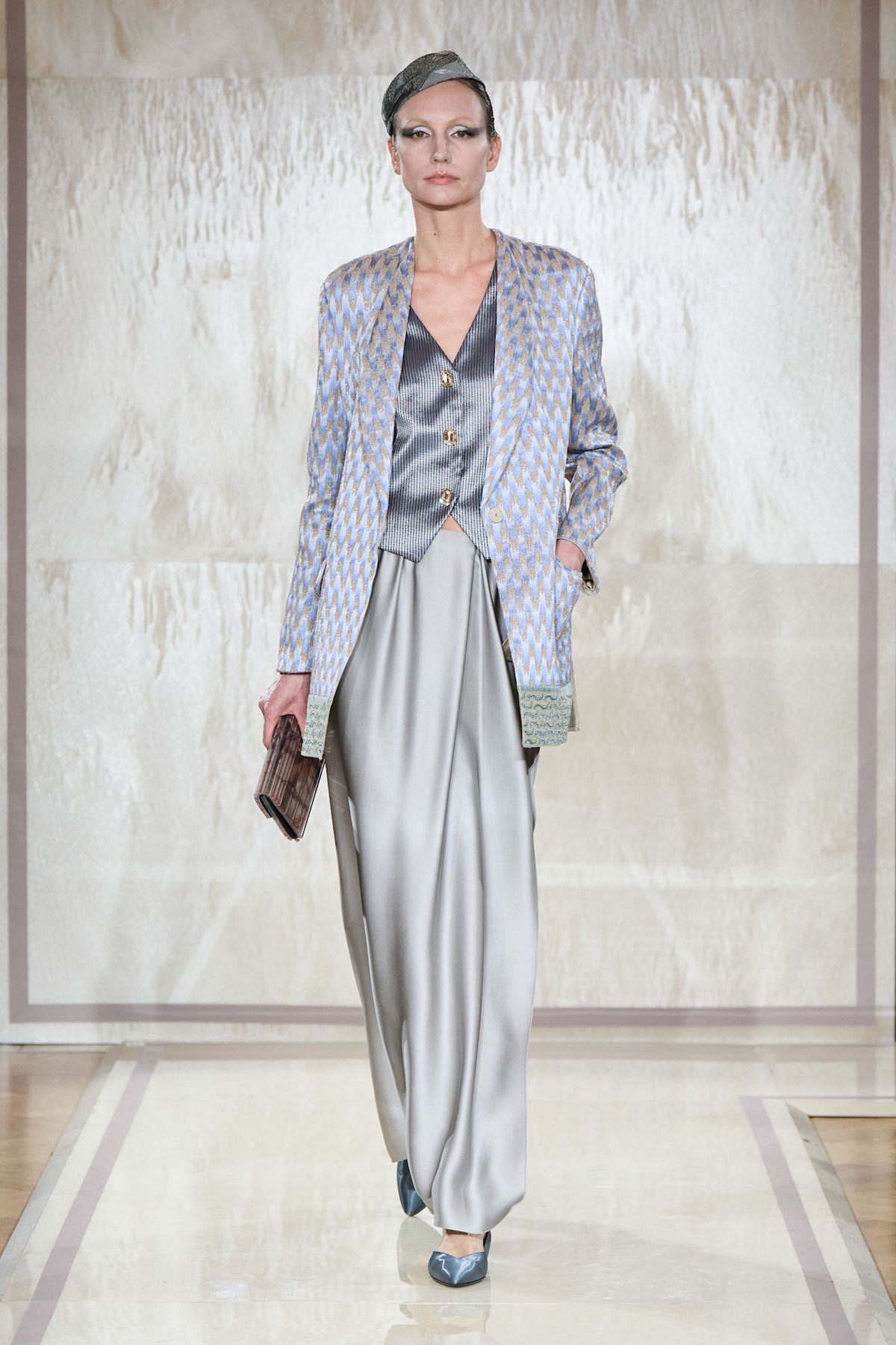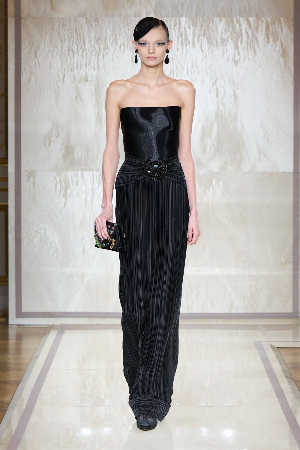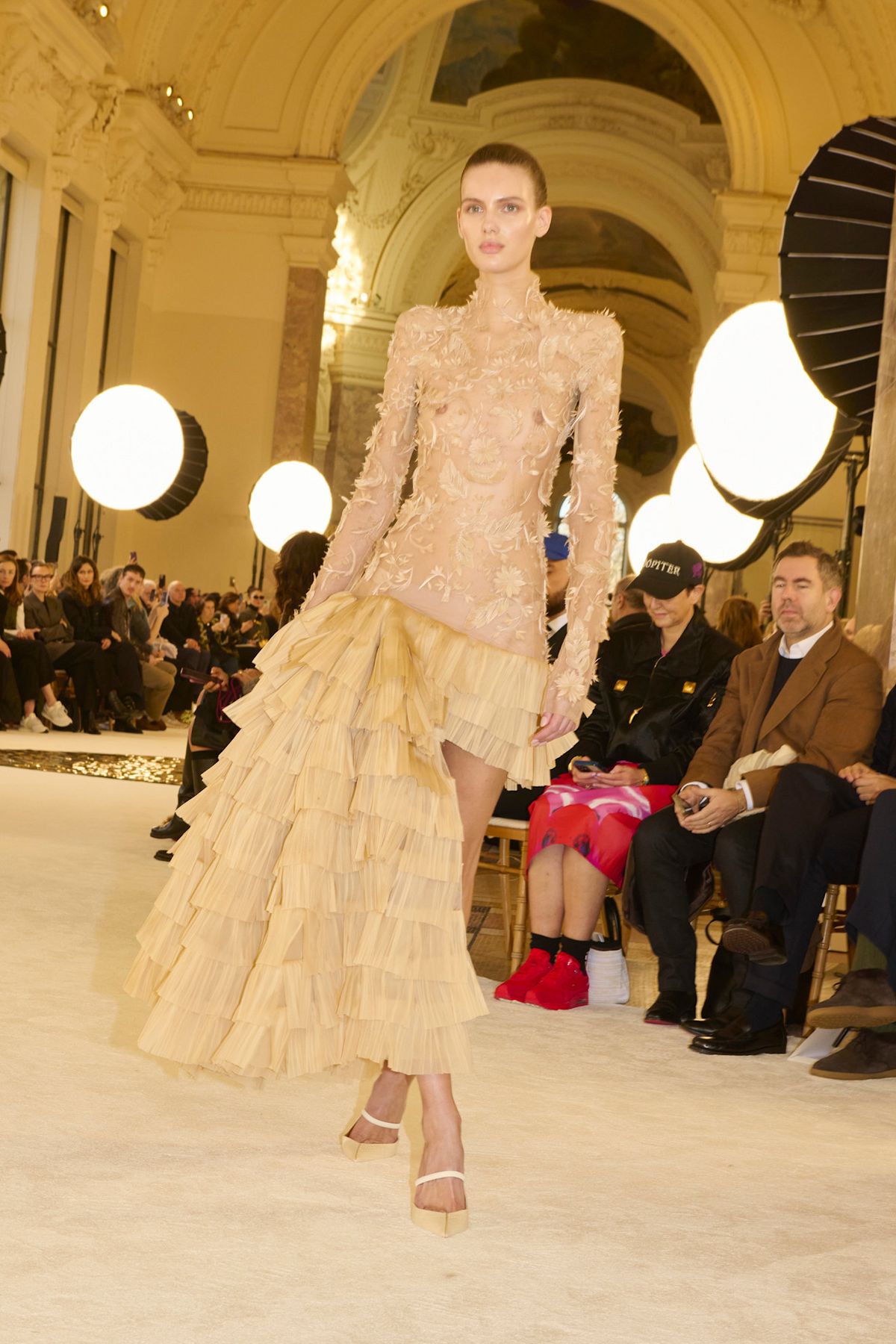 그의 말 처럼, 이번 컬렉션은 쿠튀리에가 도달할 수 있는 정점을 보여주었다. 조각적인 기법을 활용해 정교한 형태와 실루엣을 구현했으며, 몸매를 강조하는 코르셋, 골반을 과장되게 보여주는 디자인이 눈길을 끌었다. 완벽함의 아이콘과 같은 켄달 제너는 이 놀라운 드레스를 신화 속 인물, 이카루스처럼 완벽하게 소화했다. 마치 쇼 장의 밝은 조명에 그을린 이카루스처럼 말이다. 비즈로 장식된 코르셋 재킷은 모델의 어깨를 감싸는 듯 했다. 러플 디테일은 더더욱 커졌다. 로즈베리는 부드럽게, 여기저기 튀어나오는 듯한 입체적인 실루엣을 만들어냈다. 그가 말하는 '유동성의 미학(Liquid deco)'를 시각적으로 구현해 낸 것이다.