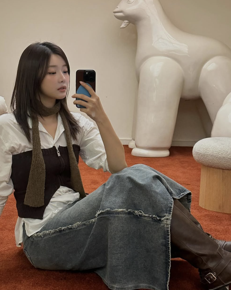평소 애정하는 아이템은 아마도 튜브톱이 아닐까. 그녀의 SNS 속 데일리룩을 삺펴보면 튜브톱을 활용한 다채로운 사복패션을 만날 수 있다. 앞서 뉴욕패션위크 스트리트 패션에서도 보았듯이 말이다. 또 다른 룩으로 화이트 셔츠에 지퍼가 장식된 브라운 튜브톱, 그리고 롱 데님 스커트 등으로 시크한 보헤미안 룩을 완성한 것. 슈즈는 믹스매치를 즐기는 그녀답게 롱부츠로 스타일링을 마무리했다. 롱부츠와 롱스커트는 실패 없는 조합. MZ 세대들이 추구하는 펑키하면서도 힙한 보헤미안 룩을 연출하기에 제격이다.