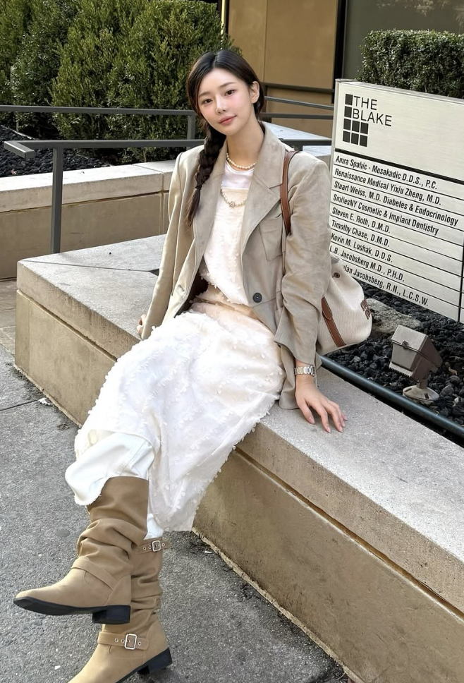 솔로지옥 4에서 모습과는 또 다른 느낌, 이시안의 청순한 오오티디를 소개한다. 베이지 재킷과 화이트 원피스의 조합은 늘 옳은 선택이다. 여기에 브라운 컬러 부츠까지. 너무 꾸미지도 않은 듯 편안하면서도 요즘 언어로 느좋녀(느낌 좋은 여자)의 룩을 연출한 것. 소개팅에 나가거나 좋아하는 상대를 만나는 그날 그녀가 선보인 이 조합을 꼭 기억하길!