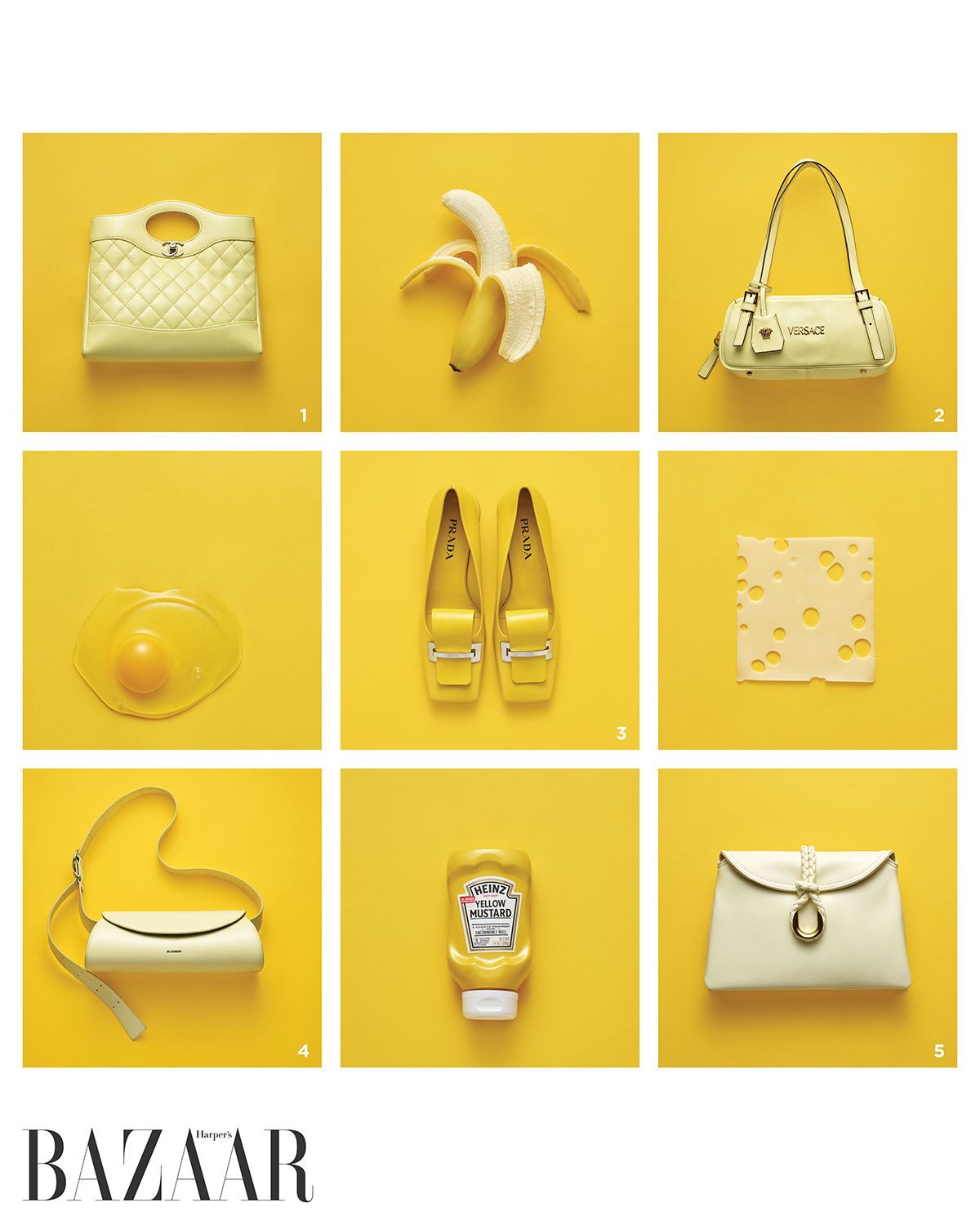 1 램스킨 소재의 ‘31’ 미니 쇼핑백은 가격 미정 Chanel. 2 메두사 모티프 키링 장식과 로고 포인트가 특징인 숄더백은 2백10만원 Versace. 3 구조적 장식이 돋보이는 펌프스는 가격 미정 Prada. 4 로고 엠보싱이 가미된 ‘카놀로’ 백은 가격 미정 Jil Sander. 5 스몰 사이즈의 ‘리베르타’ 백은 가격 미정 Bottega Veneta.