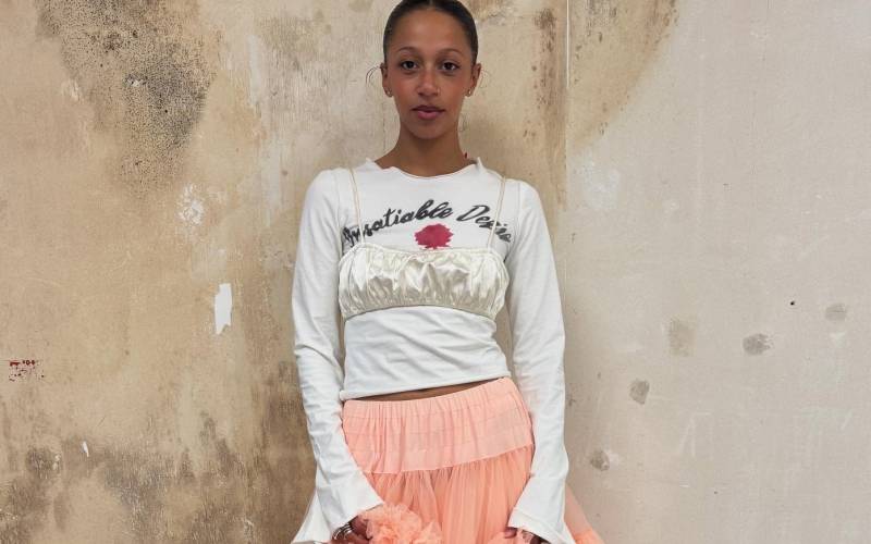 크롭트 재킷은 Juun.J. 뷔스티에는 Dior. 체크 셔츠는 가격 미정, 백 참으로 활용한 테디베어 키링은 48만원 Vivienne Westwood. 스커트는 55만원대 Weekend MaxMara. 목걸이는 52만원 Dolce & Gabbana. 반지는 모두 McQueen. 백은 69만원대 Polo Ralph Lauren. 백 체인은 Balenciaga. 슈즈는 Prada. 타이츠는 에디터 소장품.