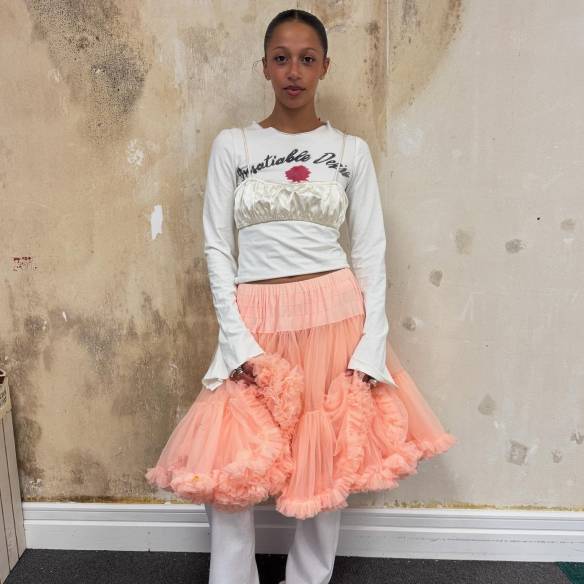 재킷, 롱스커트는 Fabiana Flippi. 셔츠, 백팩은 Celine by Hedi Slimane. 귀고리는 Balenciaga. 브로치는 Valentino Garavani. 안경, 반지는 McQueen. 타이는 Saint Laurent by Anthony Vaccarello. 벨트는 MaxMara.