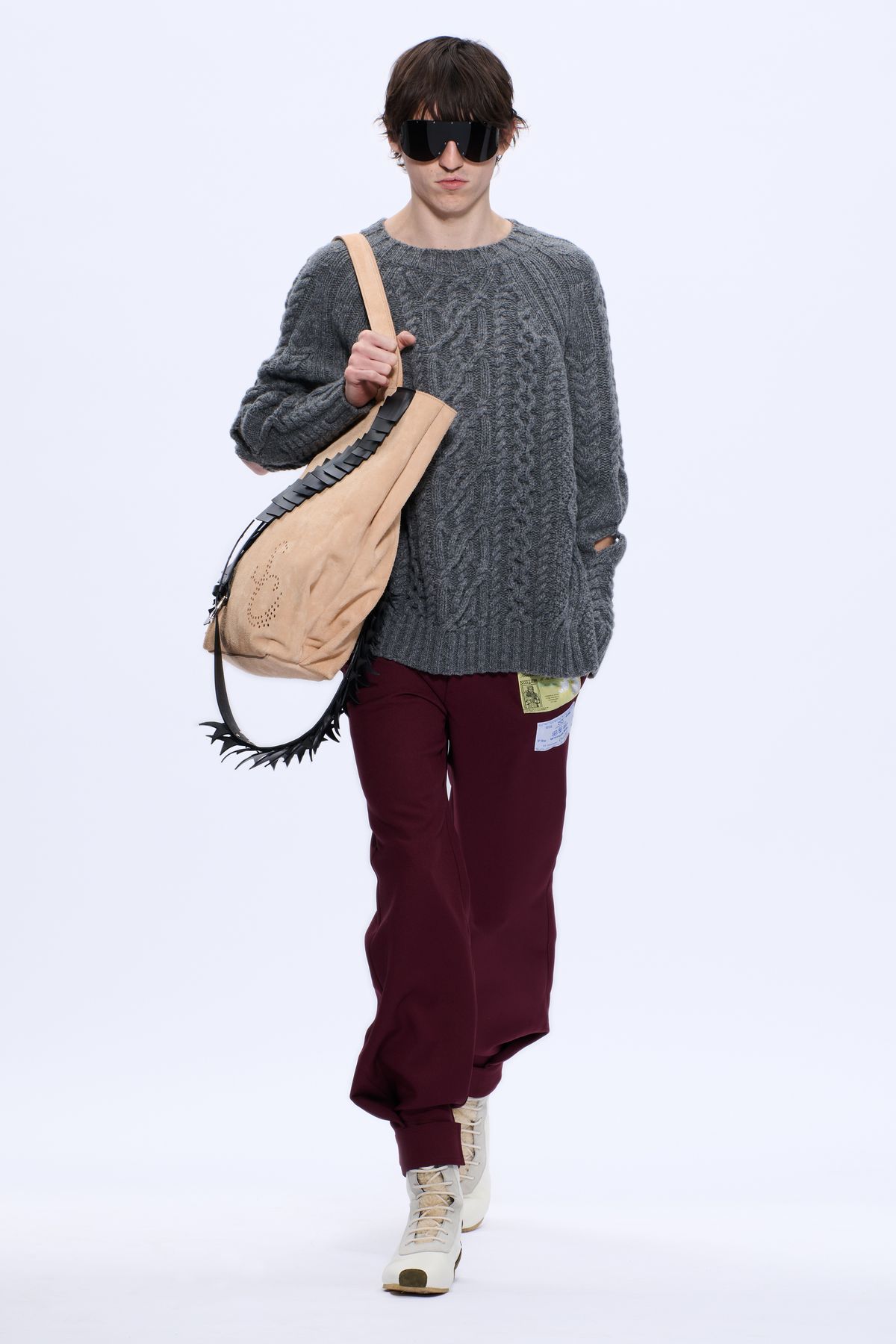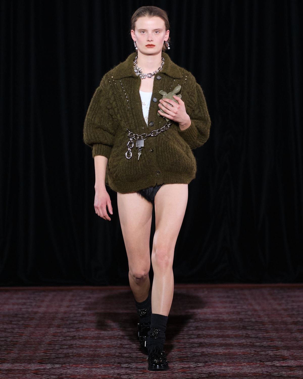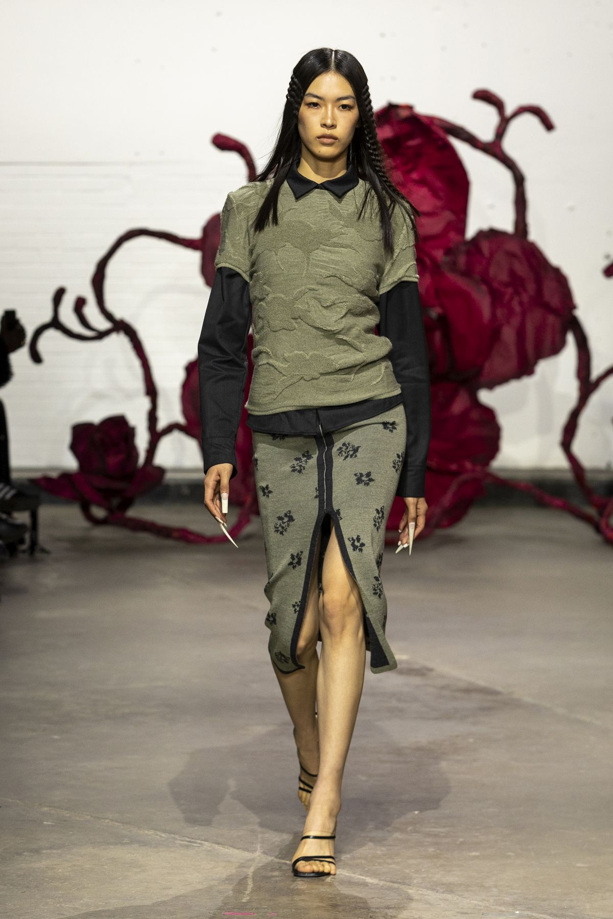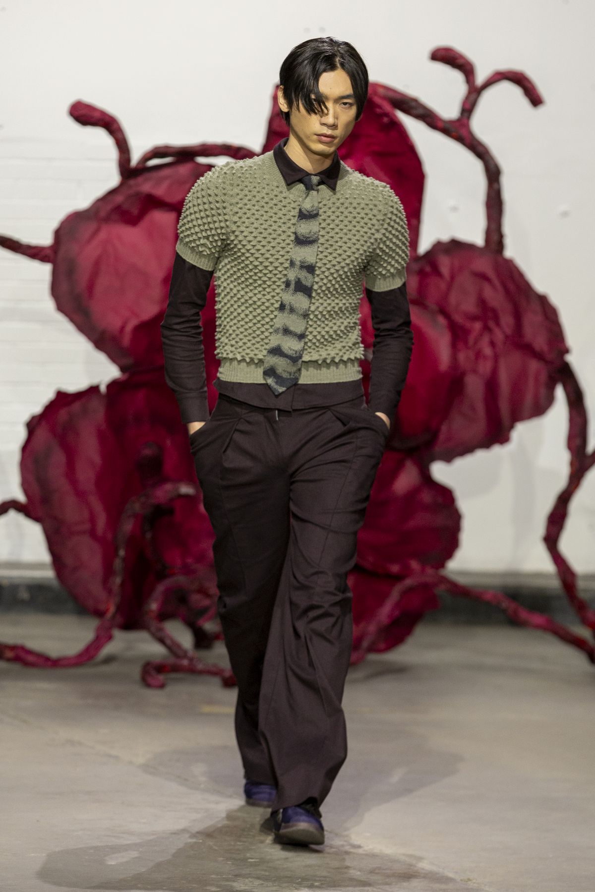 독창적인 스파이크 니트와 실험적인 디자인으로 매 시즌 강렬한 존재감을 드러내는 쳇 로. 이번 컬렉션에서 그는 다시금 자신의 뿌리로 돌아갔다. 중화풍(Chinoiserie)에 스며든 서구적 시선을 되돌아보며 익숙한 이미지를 낯설게 비튼다. 과장된 타이거 패턴, 폭발하듯 찣긴 실루엣 속 용의 형상. 그 틈새로 피어난 작은 꽃들이 거칠고 역동적인 무드와 대조를 이루며 독특한 균형을 만든다. 문화적 고정관념을 뒤흔들고, 과거와 현재, 동양과 서양의 경계를 흐리는 과정에서 쳇 로 특유의 실험적 감성이 빛을 발한다. @chet__lo