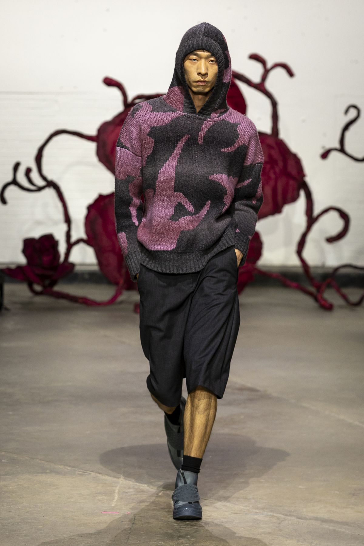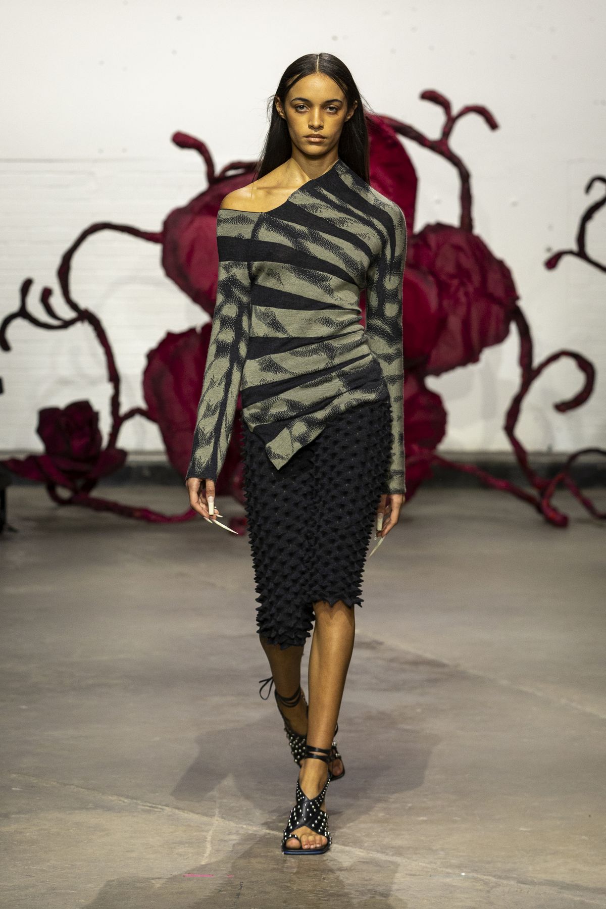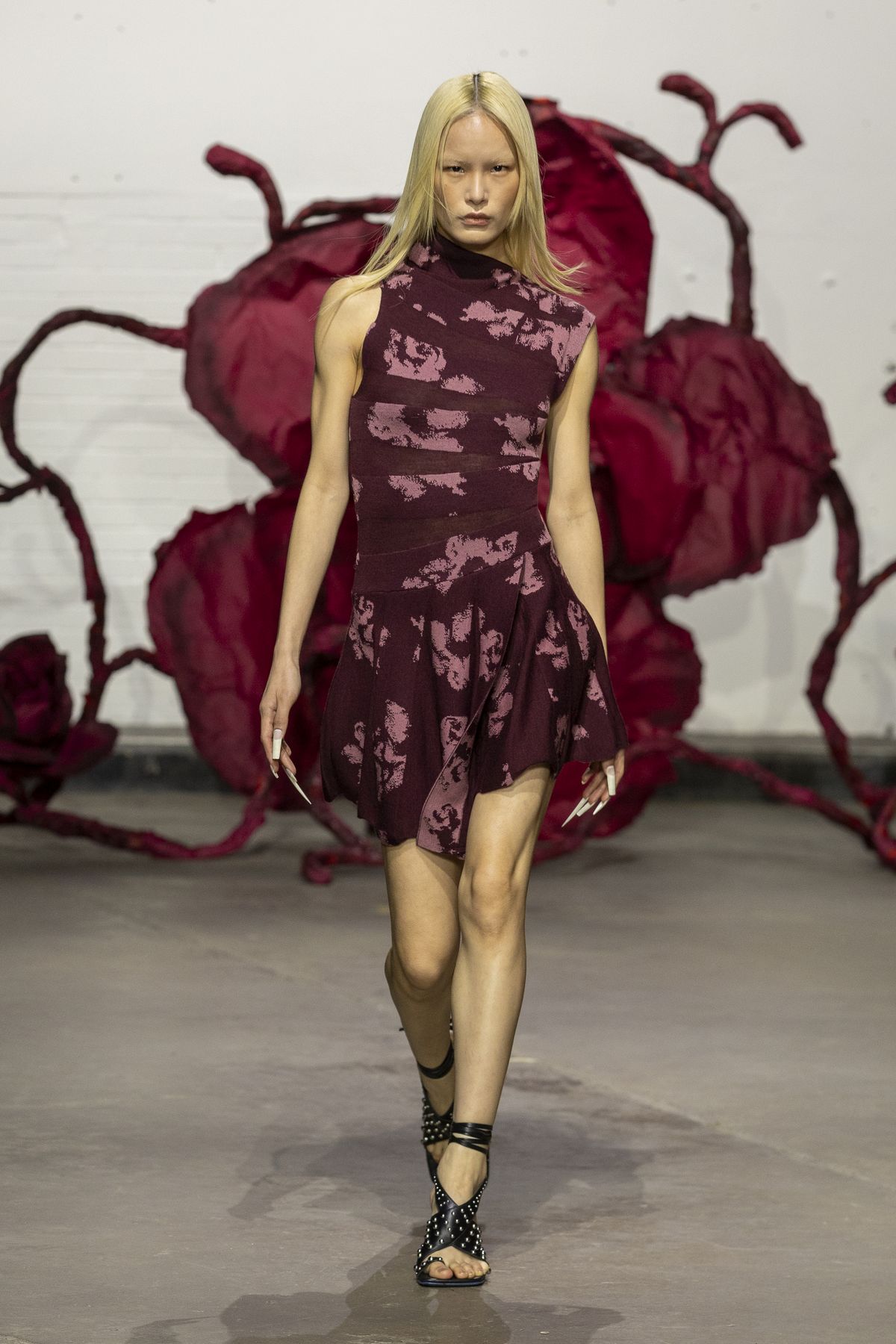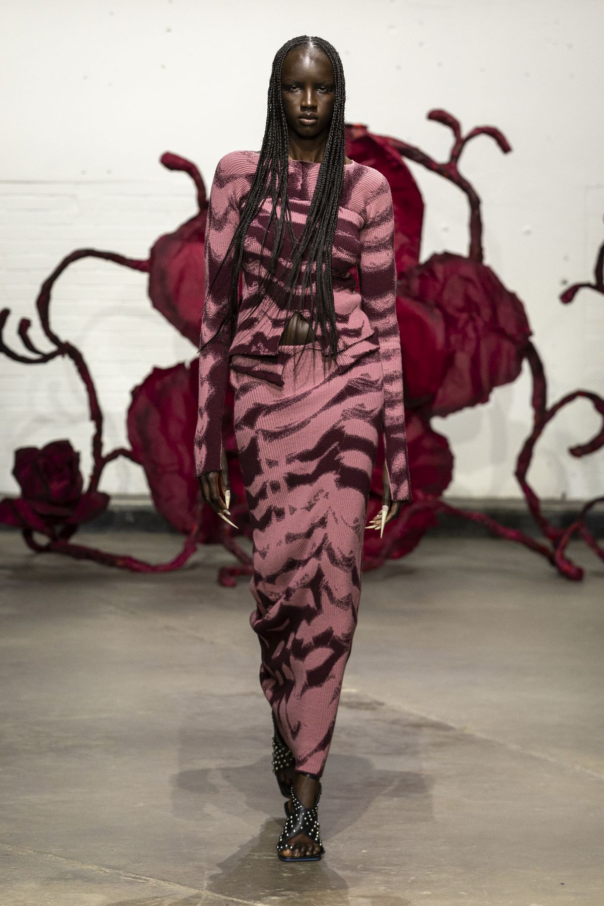 독창적인 스파이크 니트와 실험적인 디자인으로 매 시즌 강렬한 존재감을 드러내는 쳇 로. 이번 컬렉션에서 그는 다시금 자신의 뿌리로 돌아갔다. 중화풍(Chinoiserie)에 스며든 서구적 시선을 되돌아보며 익숙한 이미지를 낯설게 비튼다. 과장된 타이거 패턴, 폭발하듯 찣긴 실루엣 속 용의 형상. 그 틈새로 피어난 작은 꽃들이 거칠고 역동적인 무드와 대조를 이루며 독특한 균형을 만든다. 문화적 고정관념을 뒤흔들고, 과거와 현재, 동양과 서양의 경계를 흐리는 과정에서 쳇 로 특유의 실험적 감성이 빛을 발한다. @chet__lo