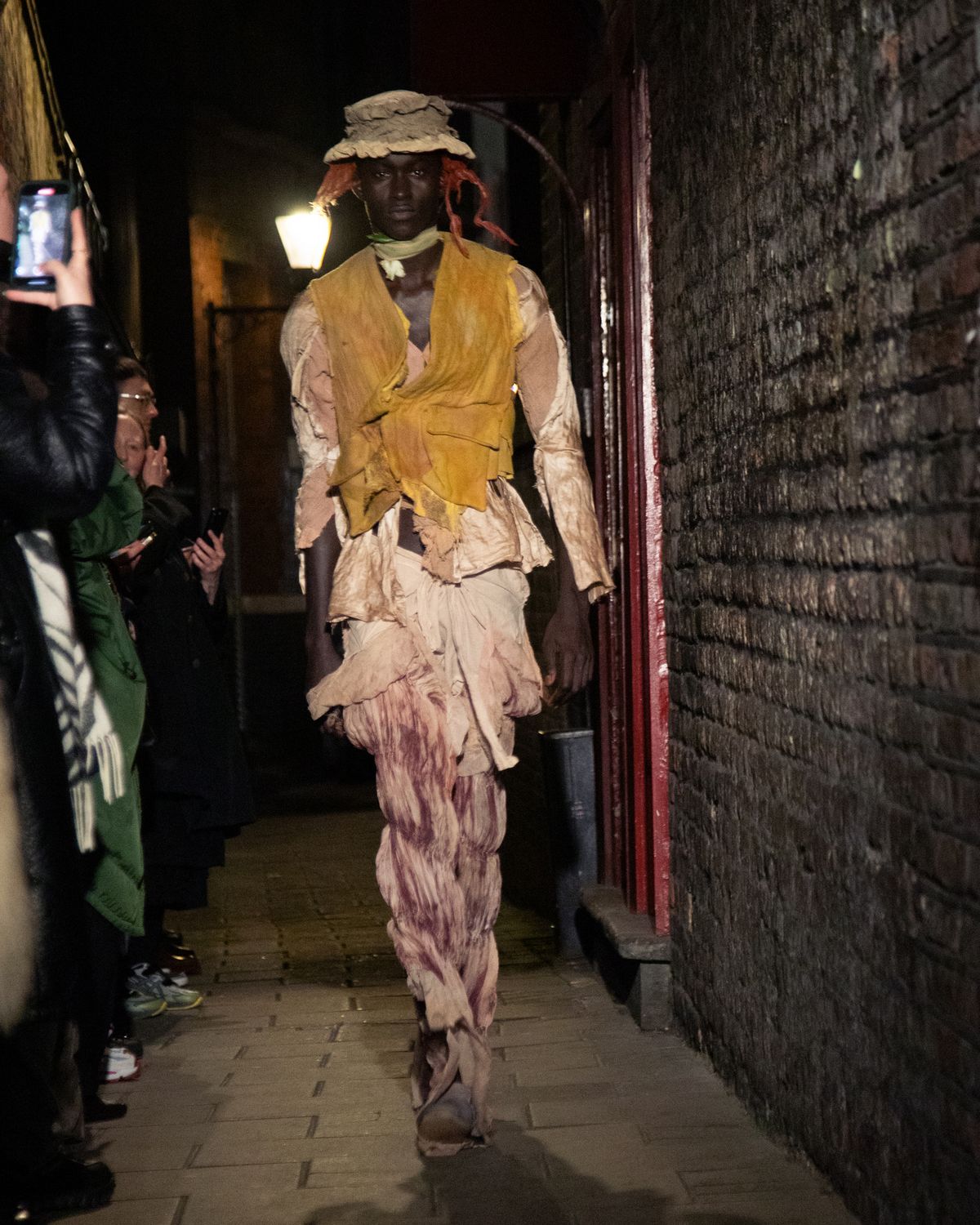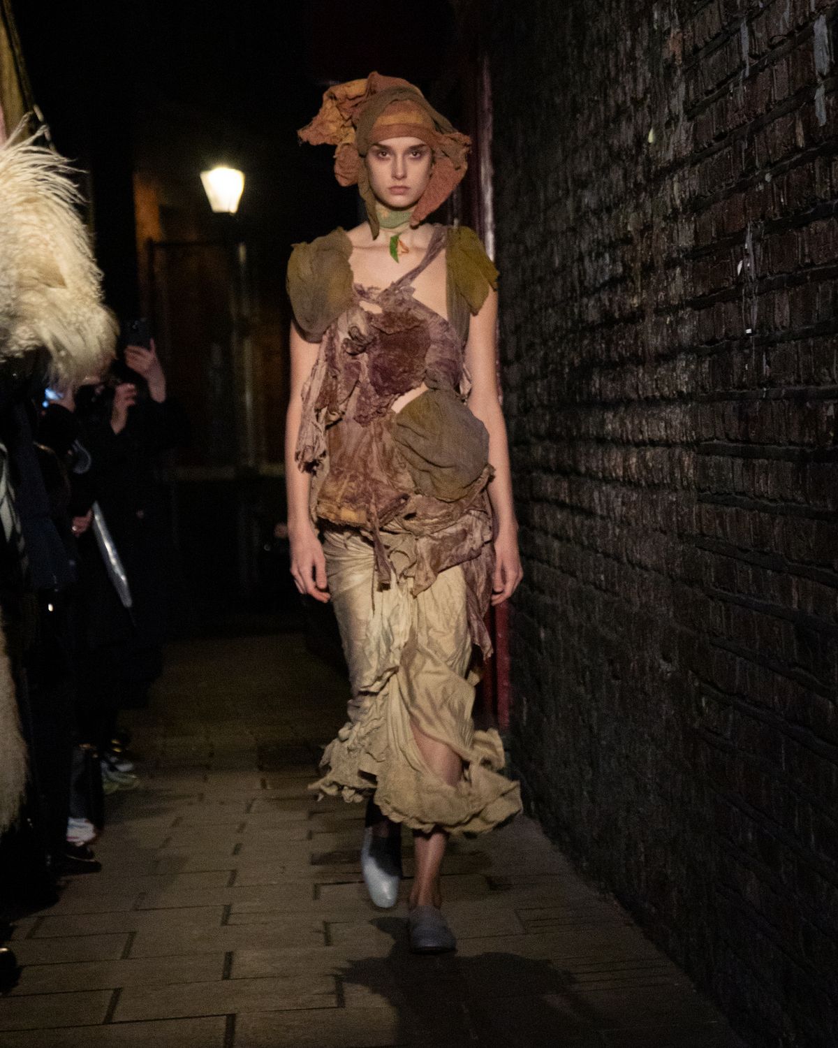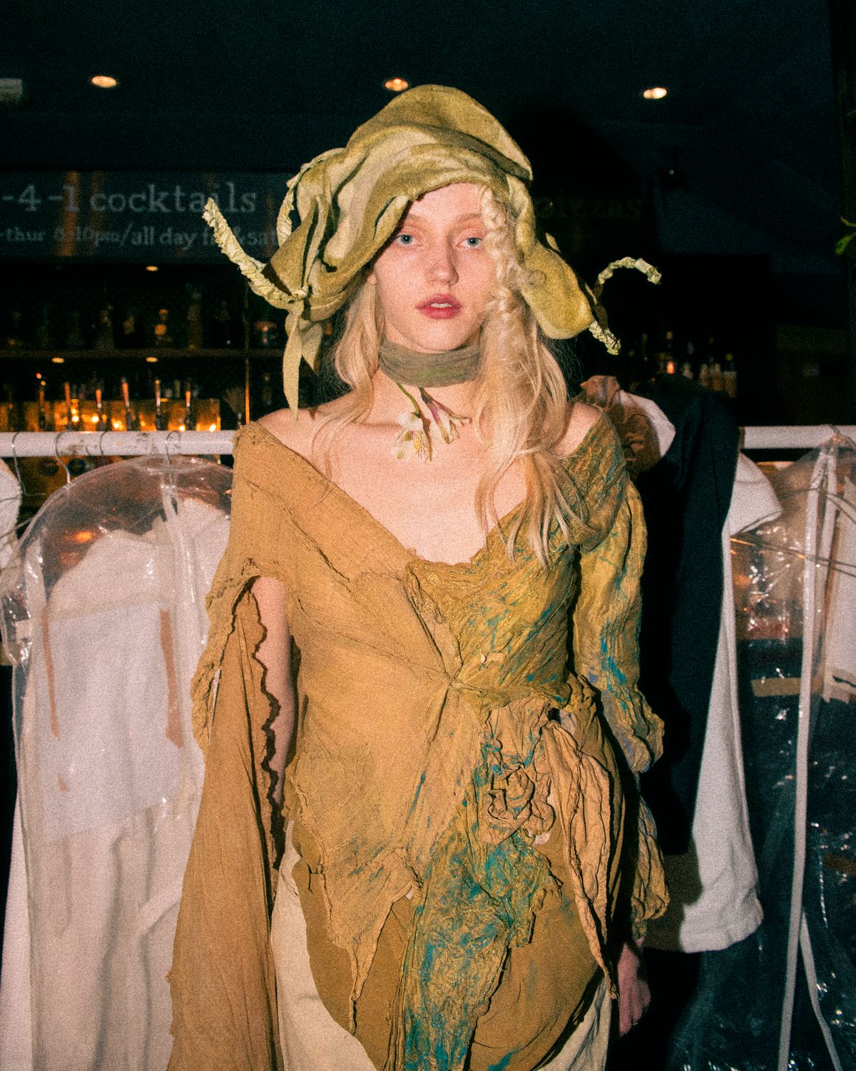 지난 시즌 자택 뒷마당에서 컬렉션을 선보였던 그가 이번엔 더 깊은 이야기가 깃든 공간으로 우리를 이끌었다. 작업실에서 불과 5분 거리에 위치한 펍, 홀리 타번(The Holy Tarvern). ‘도축장의 날개 없는 용(Dragons Unwinged at the Butcher’s Block)’이라고 명명된 이번 컬렉션은 지난해부터 이어온 ‘희망의 3부작(Trilogy of Hope)’의 마지막 챕터다. “인간이 지구를 파괴하는 행위, AI 기술의 발전으로 인해 점점 사라져가는 창의적 고찰・・・. 어쩌면 우리는 스스로 날개를 잃고 있는 것은 아닐까요?” 그가 던진 질문에 대한 답은 컬렉션 속에 있다. 로그우드, 강황, 매더, 코치닐 등 천연염료로 물들인 색감, 유려하게 흐르거나 부드럽게 몸을 감싸는 레이어에서 느껴지는 투박한 손맛, 정형화된 패턴에서 벗어난 자유로운 실루엣. 결국, 파올로는 창조적 행위 자체가 희망임을 이야기한다. @paolocarzana