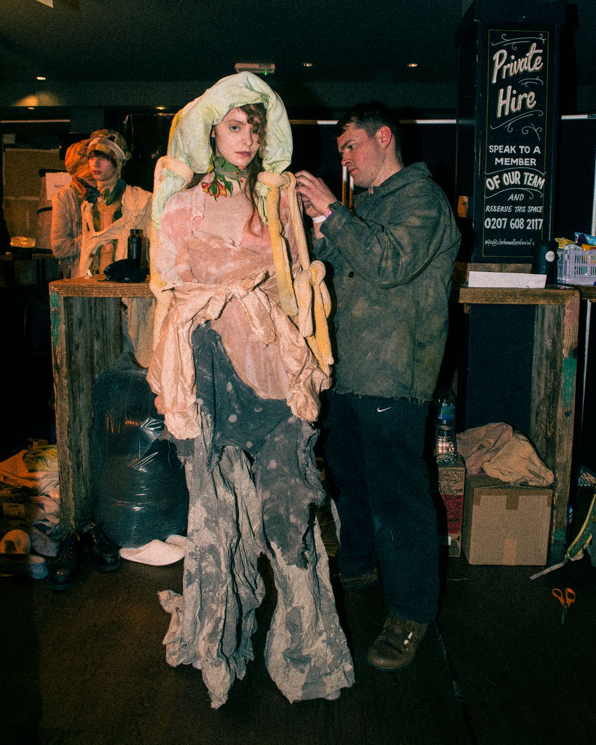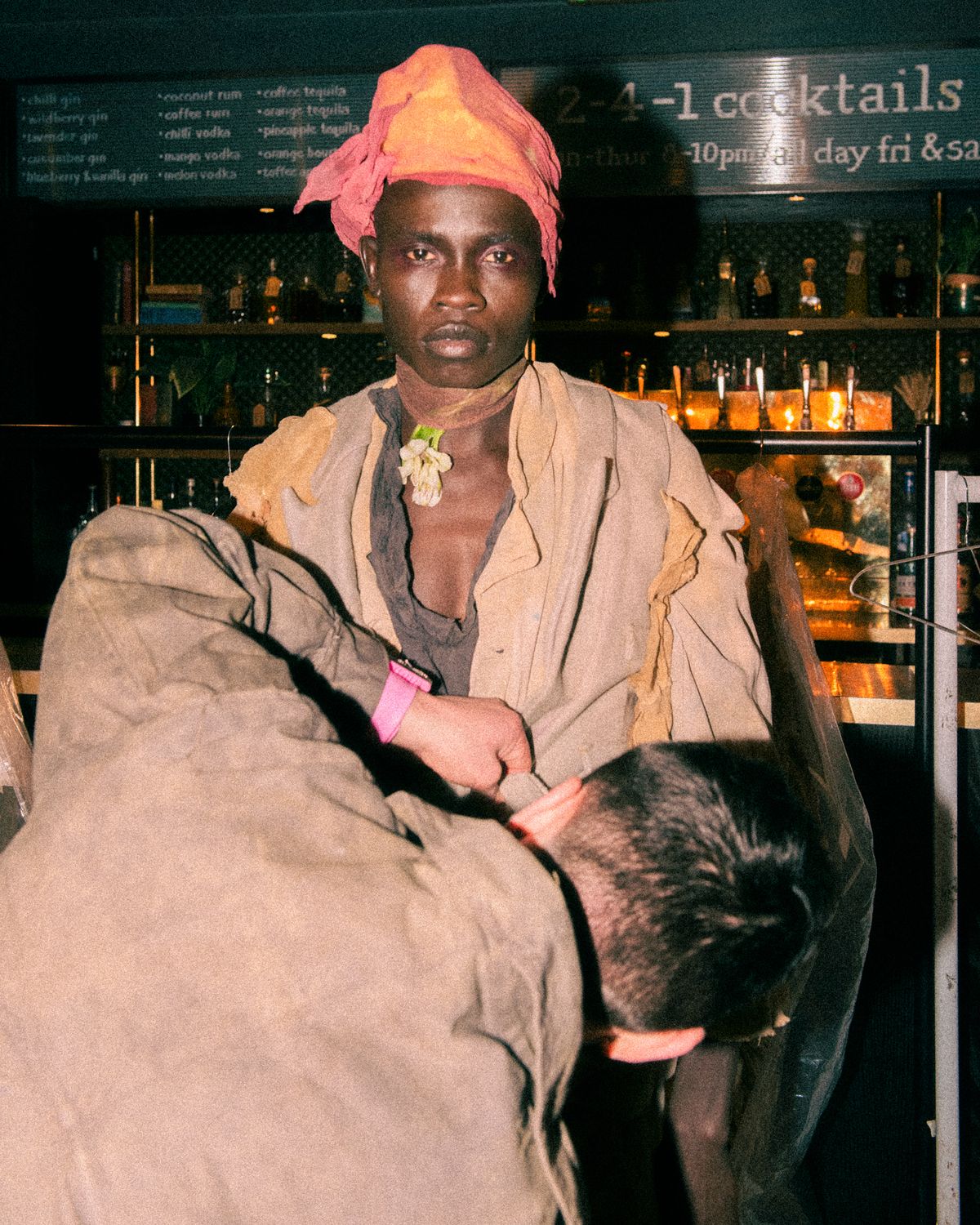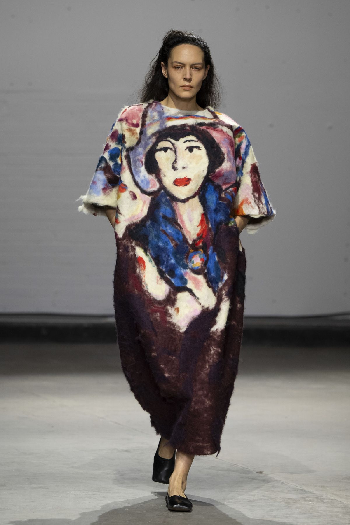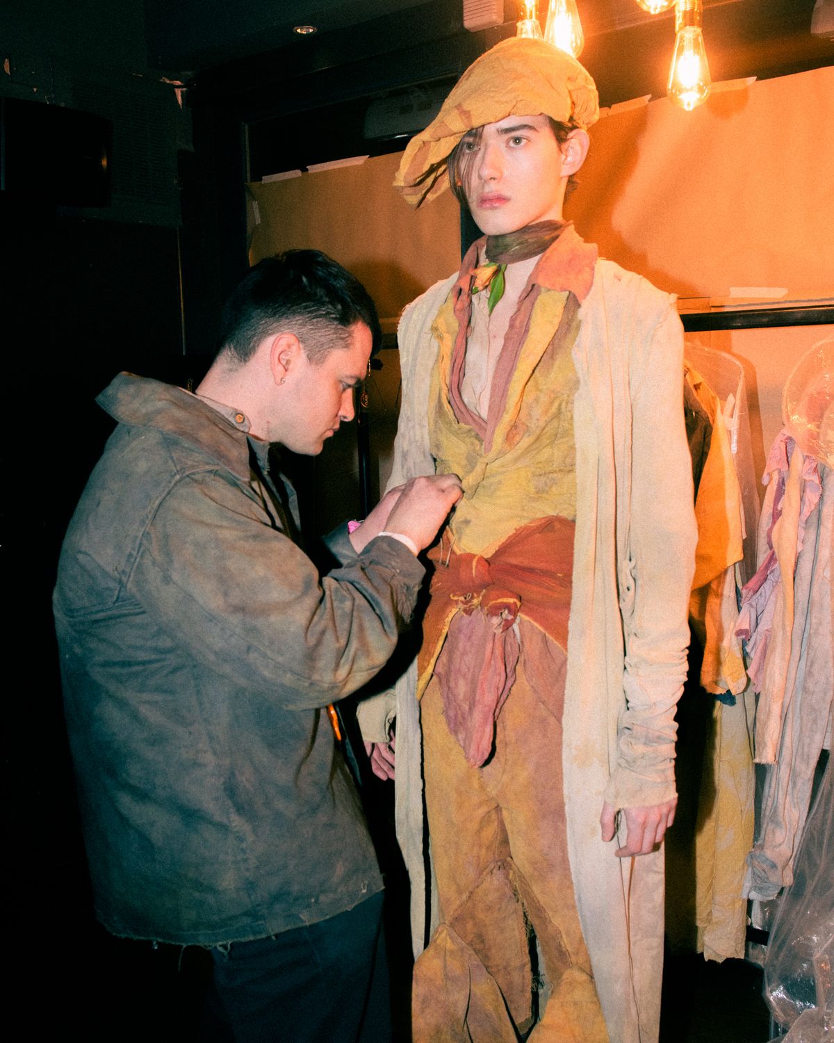 지난 시즌 자택 뒷마당에서 컬렉션을 선보였던 그가 이번엔 더 깊은 이야기가 깃든 공간으로 우리를 이끌었다. 작업실에서 불과 5분 거리에 위치한 펍, 홀리 타번(The Holy Tarvern). ‘도축장의 날개 없는 용(Dragons Unwinged at the Butcher’s Block)’이라고 명명된 이번 컬렉션은 지난해부터 이어온 ‘희망의 3부작(Trilogy of Hope)’의 마지막 챕터다. “인간이 지구를 파괴하는 행위, AI 기술의 발전으로 인해 점점 사라져가는 창의적 고찰・・・. 어쩌면 우리는 스스로 날개를 잃고 있는 것은 아닐까요?” 그가 던진 질문에 대한 답은 컬렉션 속에 있다. 로그우드, 강황, 매더, 코치닐 등 천연염료로 물들인 색감, 유려하게 흐르거나 부드럽게 몸을 감싸는 레이어에서 느껴지는 투박한 손맛, 정형화된 패턴에서 벗어난 자유로운 실루엣. 결국, 파올로는 창조적 행위 자체가 희망임을 이야기한다. @paolocarzana