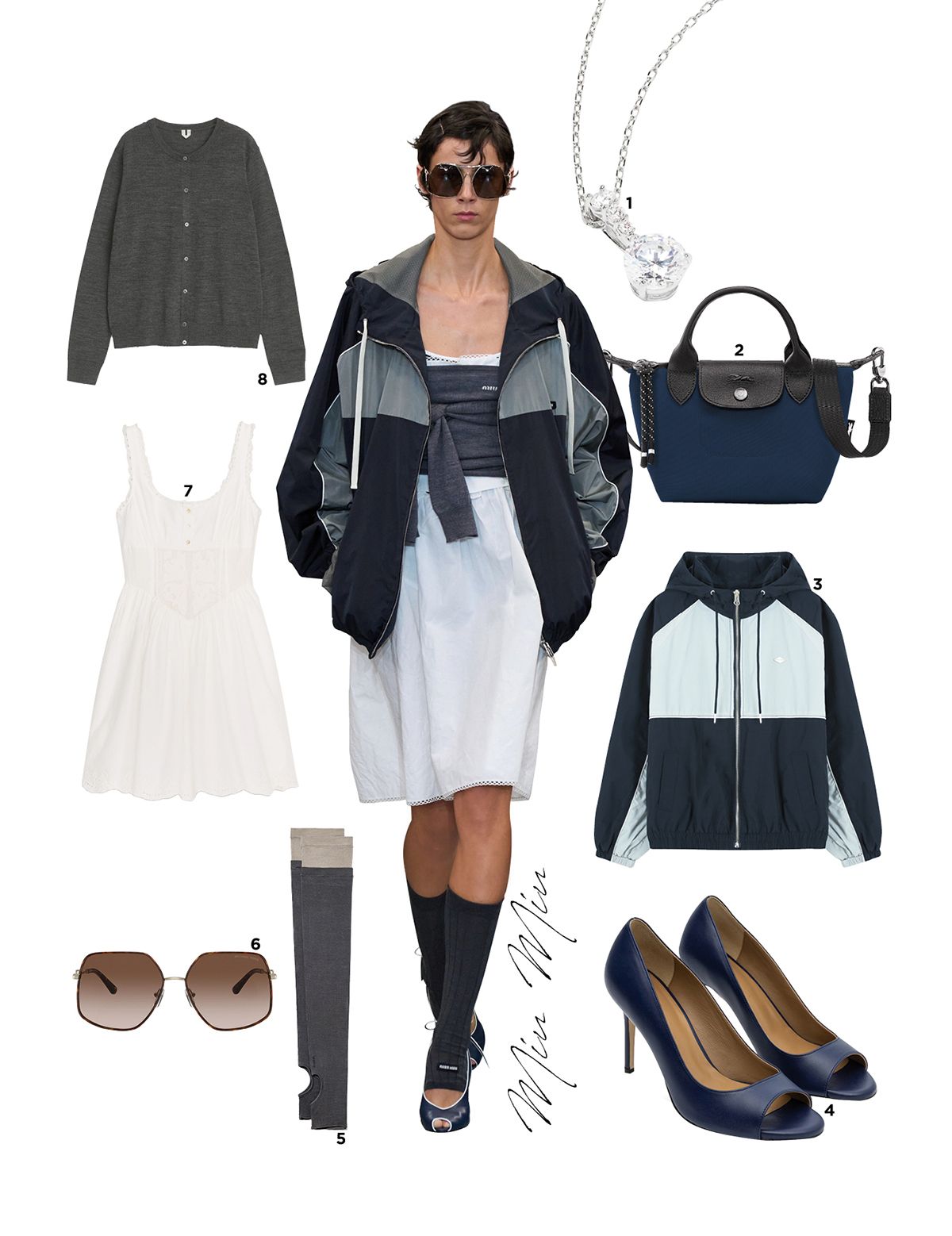 1 크리스털 목걸이는 15만원대 Swarovski by Farfetch. 2 톱 핸들 백은 40만원 Longchamp. 3 윈드브레이커는 19만원대 Tilldie. 4 오픈 토 펌프스는 25만원대 Oyatlee. 5 레그 워머는 4만원대 Open Yy. 6 선글라스는 45만원대 Michael Kors by Farfetch. 7 펀칭 레이스 원피스는 8만원대 Zara. 8 카디건은 11만원대 Arket.