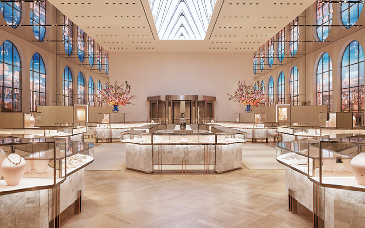 1층의 중앙 공간을 따라 이어지는 워치 & 화인 주얼리 공간은 보다 친밀한 분위기를 자아낸다. 수작업으로 금박을 입힌 천장과 섬세하게 마감된 골드 메탈 블랙 캐비닛 벽이 조화를 이룬다. 여기서 끝이 아니라 2층에도 또 하나의 워치 & 화인 주얼리 살롱이 마련되어 있다. 아르데코에서 영감을 받은 카펫의 메탈릭한 디테일을 비추는 브론즈 스크린과 해머드 브론즈 메탈 캐비닛이 공간을 장식한다. 한쪽 벽난로 옆에는 피터 레인의 유약을 입힌 세라믹 벽 조각이 배치되어 있으며, 로베르 구센의 샹들리에가 화려한 중심을 이룬다.