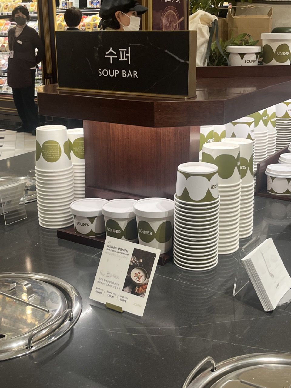 신세계 강남점 식품관의 메시지는 명확하다. “누구나 자신의 하루를, 일상을 꾸려나가고 싶은가를 상상하게 하라.” 오늘 뭐 먹을까에 대한 고민과는 층위가 완전히 다르다. 보다 깊고 더 세심히 접근할 필요가 있음을 이해하고 고도화된 큐레이션을 제안한다. 유리병에 담긴 컬러풀한 피클과 신선한 올리브, 시즈널 채소와 시즈오카산 와사비처럼 흔히 볼 수 없는 식재료들을 만날 수 있다. 품질 좋은 농산물이나 유기농이라는 말로는 다 담기지 않는다. 치즈를 소분해 구매할 수 있게 한 치즈 바 코너는 오감으로 느껴지는 음식 조합의 상상을 자극하고 실생활에서 바로 활용할 수 있는 레시피의 단서처럼 구성했음을 알 수 있다. 고객이 주체적으로 즐겁게 요리하는 장면을 연상시키는 구조에 가까운 것이다. 직접 건강한 식단을 요리해 먹는 가정식 기반의 식문화가 회복되는 최근 유행 트렌드와도 맞물려, 생활로서의 식문화를 제안하는 역할을 할 수 있는 가능성을 보여준다. 외에도 국내 수프 브랜드 수퍼, 호주 멜버른 기반 스페셜티 커피 브랜드 마켓 레인도 놓칠 수 없다.