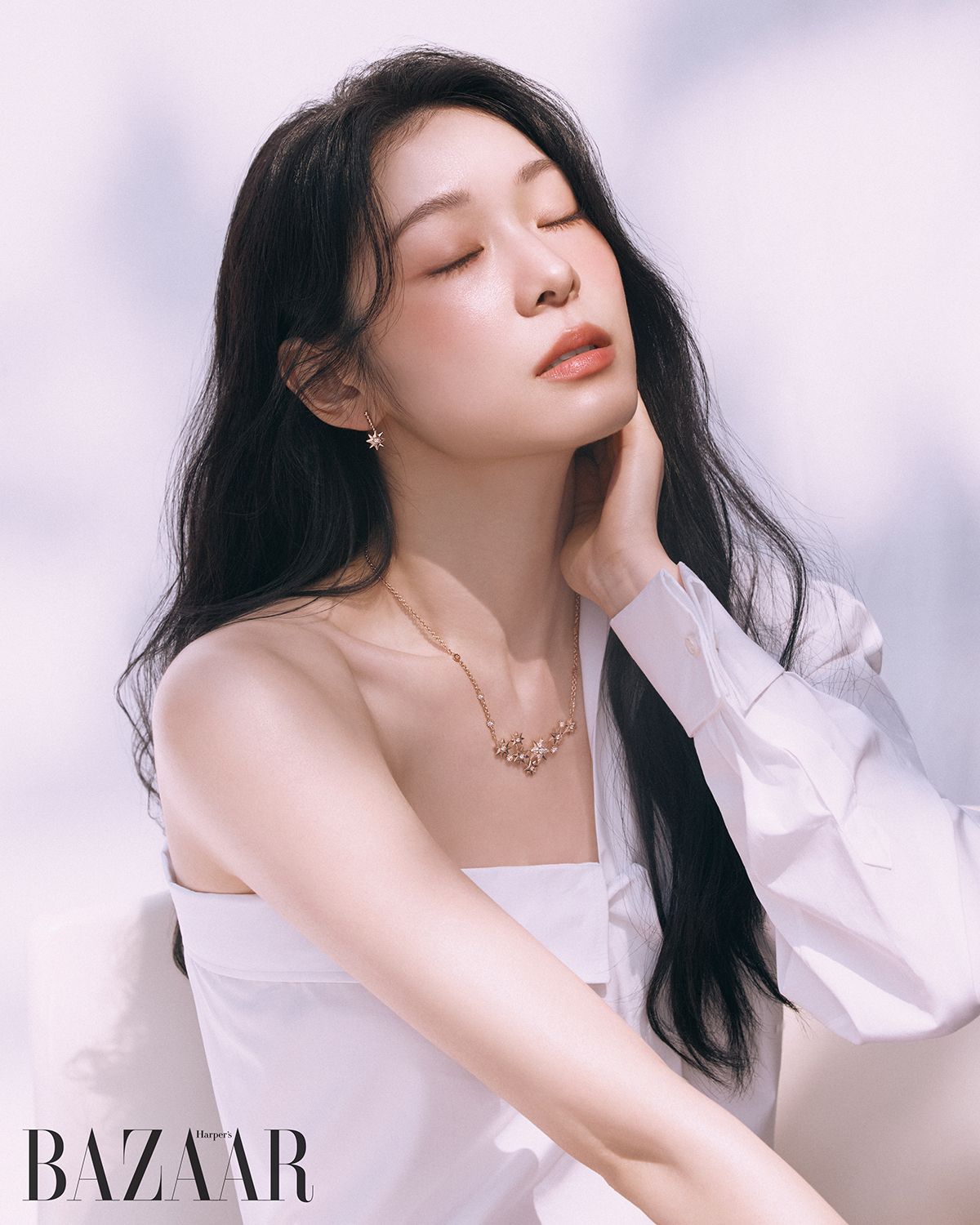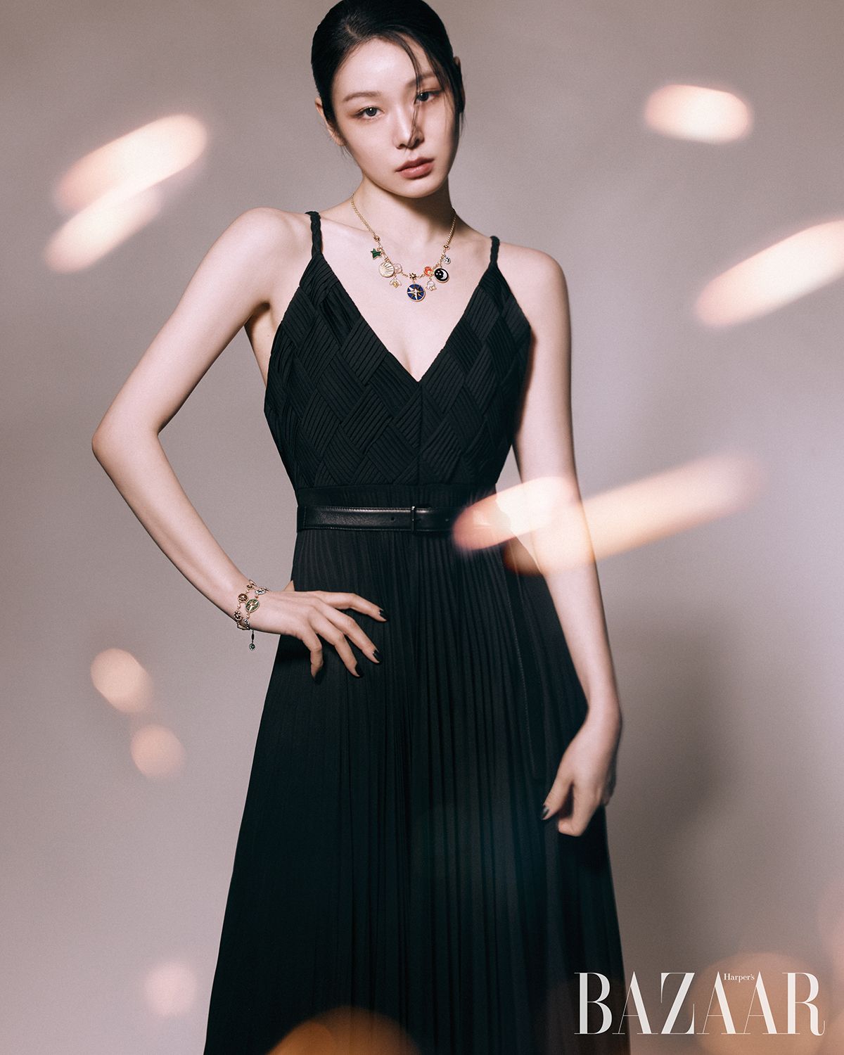옐로 골드에 다이아몬드와 머더오브펄, 오닉스를 세팅한 ‘로즈 셀레스트’ 이어링, 오른손 검지에 착용한 ‘로즈 셀레스트’ 링, 오른팔에 착용한 옐로 골드에 다이아몬드와 머더오브펄이 장식된 ‘로즈 드 방’ 브레이슬릿, 그 아래 레이어드한 ‘로즈 셀레스트’ 브레이슬릿, 왼손 중지에 착용한 핑크 골드에 다이아몬드와 오닉스를 세팅한 ‘로즈 드 방’ 링은 모두 Dior Joaillerie. 홀터넥 드레스는 Dior.