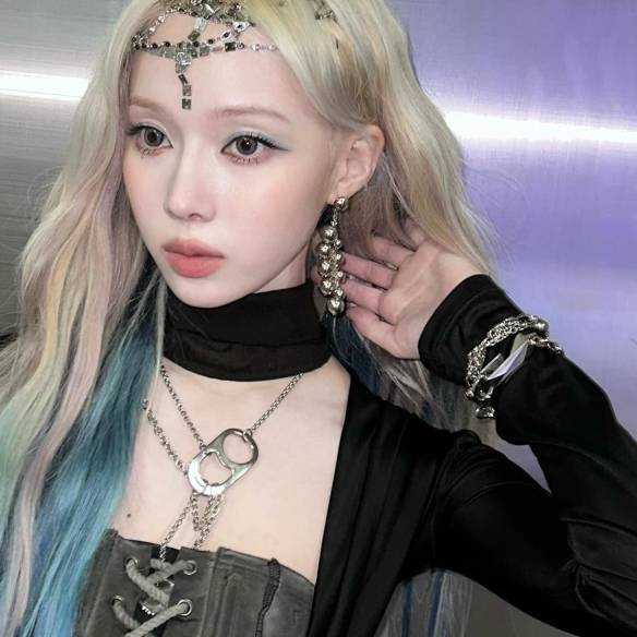 조명 아래서 존재감을 발휘하고 싶다면, 평소 그리던 오버립을 네온 페인트로 연출해보자. 입술 전체를 따라 그리기보다 윤곽만 잡아주면 자연스럽게 모양을 보완하고 볼륨을 강조할 수 있다. 안쪽에는 펄 글로스를 바르고 컬러 글리터를 군데군데 올려 반짝임을 더했다. 모발을 반쯤 올려 양쪽으로 묶은 ‘하프업 스페이스 번(Half-Up Space Buns)’은 힙하면서도 사랑스러운 무드를 동시에 살릴 수 있다. 컬러 끈이나 피스로 장식하면 한층 유니크하다.