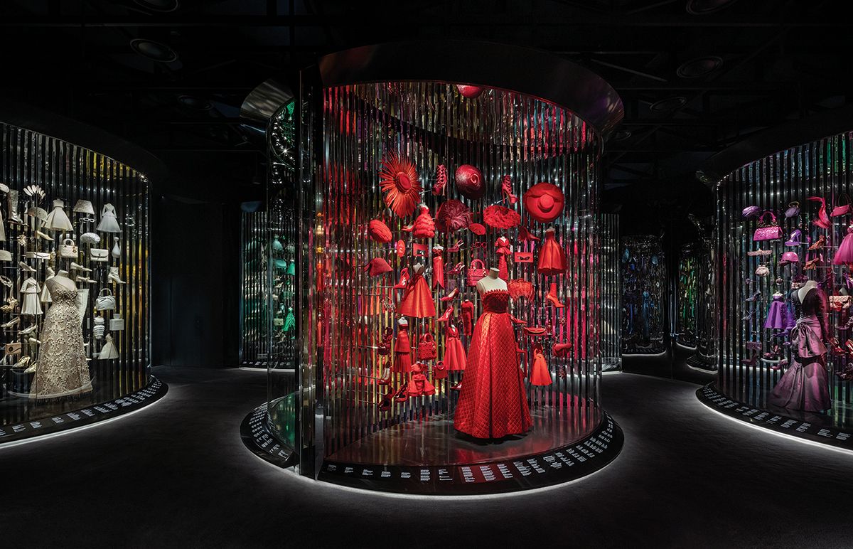 디올 하우스의 컬러 철학을 다채롭게 보여주는 아카이브의 방. 향수, 백, 메이크업, 모자 등 액세서리를 색상별로 분류, 75년간의 아카이브를 하나의 팔레트처럼 구성했다. 브랜드의 창의성과 감각이 어떻게 컬러를 통해 발현했는지를 한눈에 확인할 수 있는 공간.