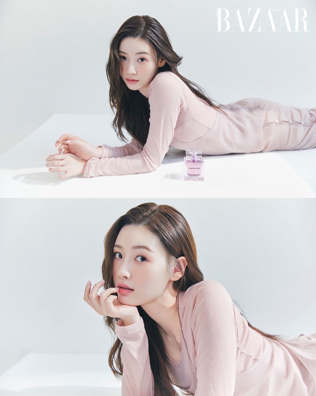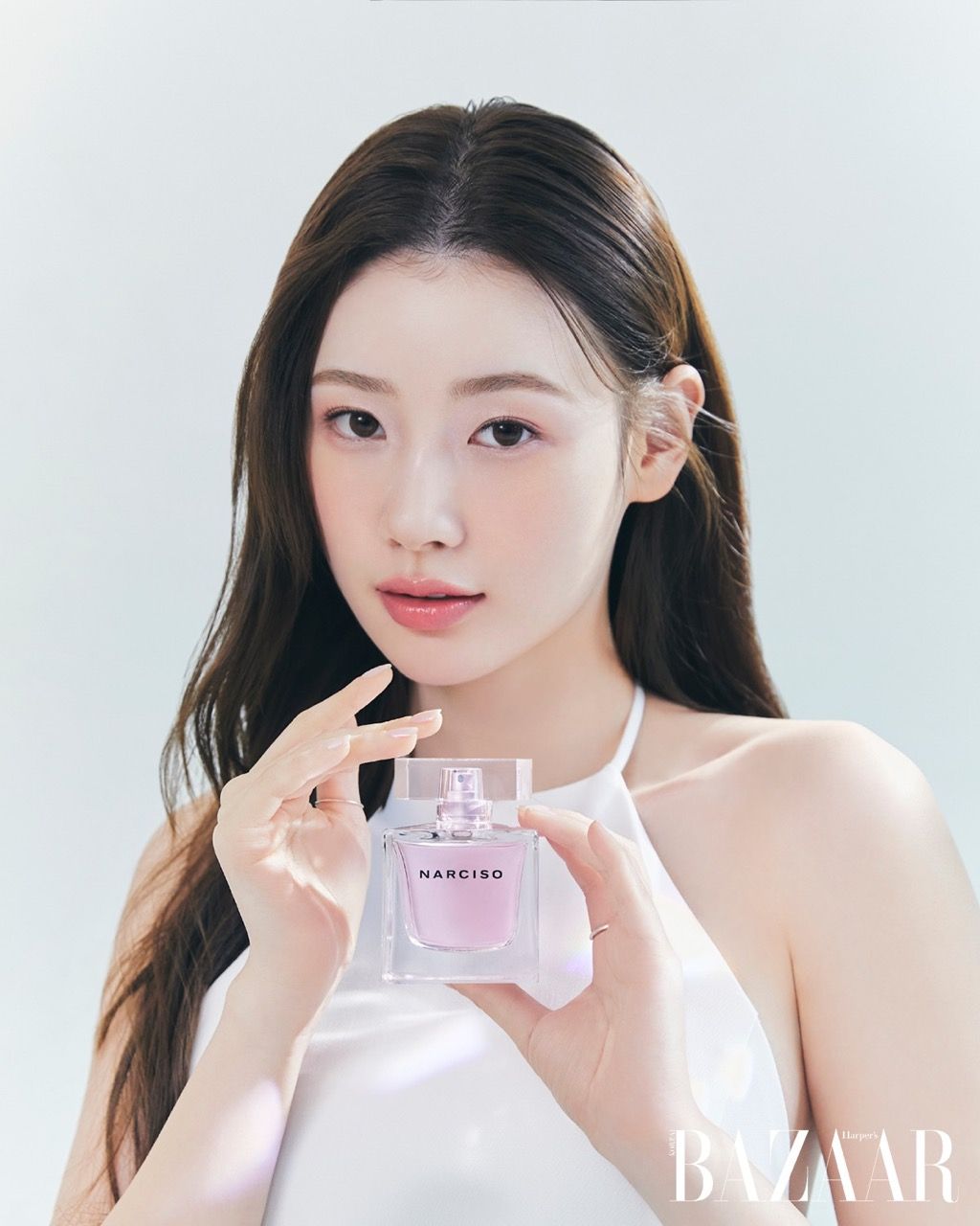 이유정은 티끌 하나 없이 하얀 공간에서 매력적인 보랏빛 향수를 들고 포즈를 취하며 인형 같은 비주얼을 뽐냈다. 평소에도 코튼 향을 즐겨 사용하는 그녀답게 촬영 내내 ‘나르시소 오 드 퍼퓸 래디언트’에 큰 애정을 드러내기도 했다.