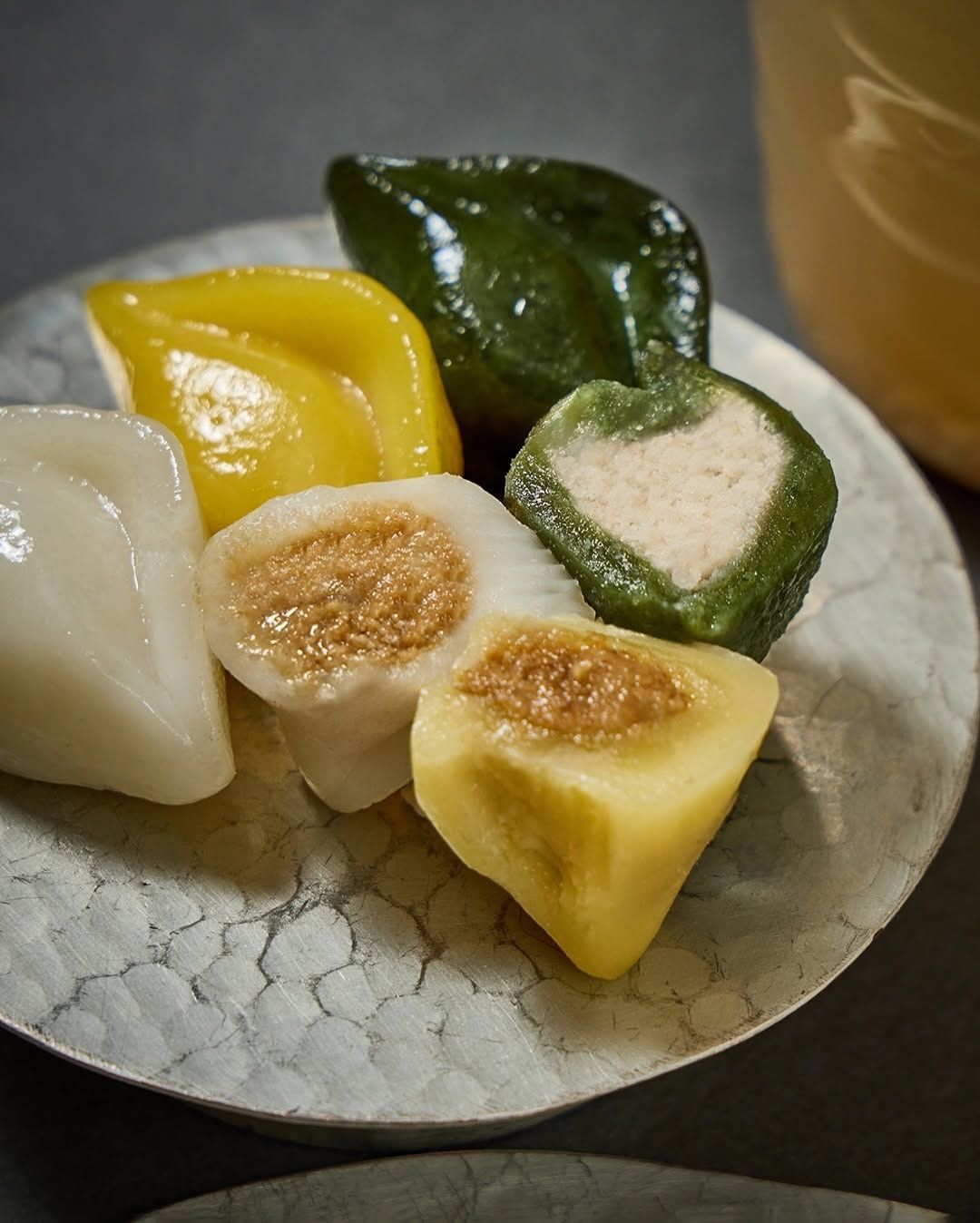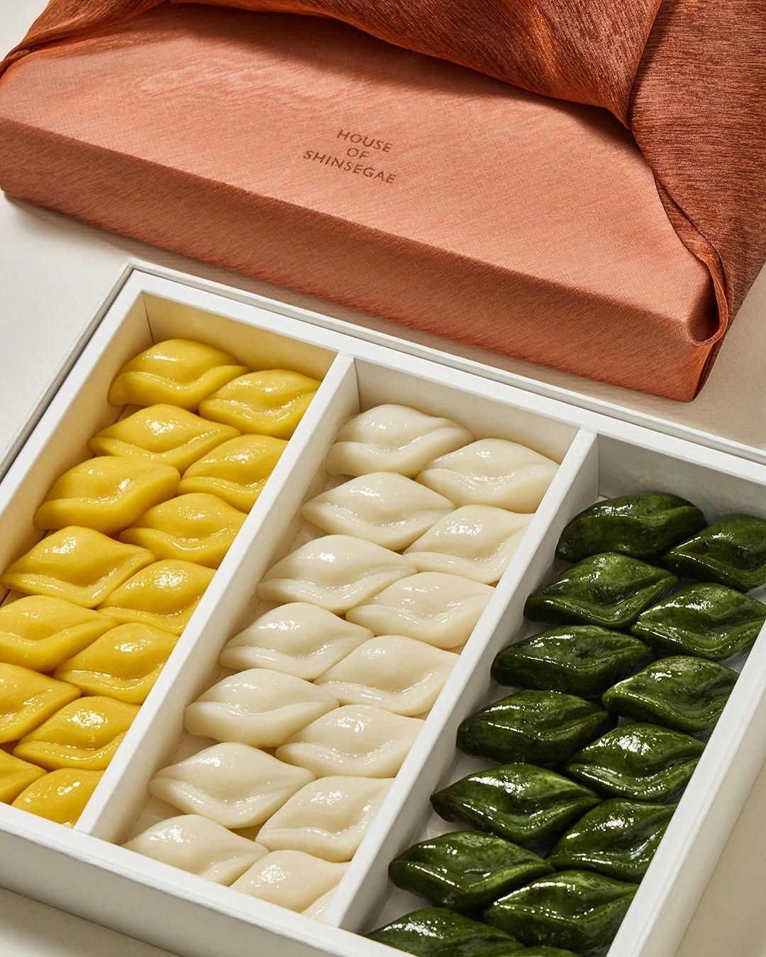 하우스 오브 신세계 디저트살롱은 명절 다과의 정수를 가장 품격 있게 보여준다. 은은한 단맛의 식혜로 시작해 삼색송편, 잣강정, 흑미아몬드강정, 김부각까지 이어지는 코스는 추석의 풍경을 한 상에 옮겨놓은 듯하다. 특히 쑥·흰·호박 세 가지 송편은 깨소와 거피팥소로 속을 채워 정성과 손맛을 담았다. 송편 세트는 지함과 보자기에 담겨 판매되며 가격은 12만원.