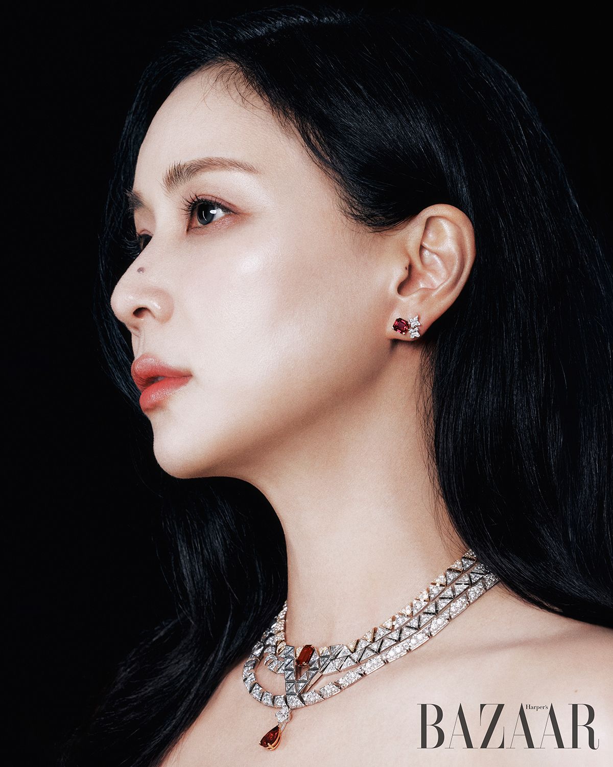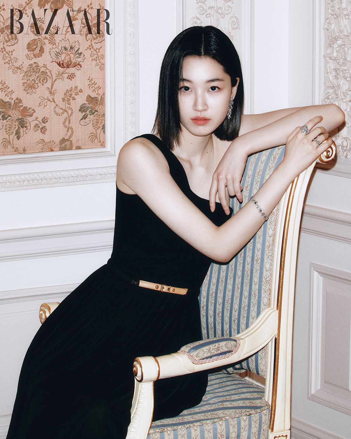 열 개의 모노그램 모티프가 연결된 ‘엘레강스’ 이어링, 검지에 착용한 ‘라 스타 뒤 노흐’ 링, 약지의 ‘뚜아 에 무아’ 링, 나베트 컷 다이아몬드와 브릴리언트 컷 다이아몬드가 조화를 이룬 ‘갤럭시’ 브레이슬릿, 드레스, 벨트는 모두 Louis Vuitton.