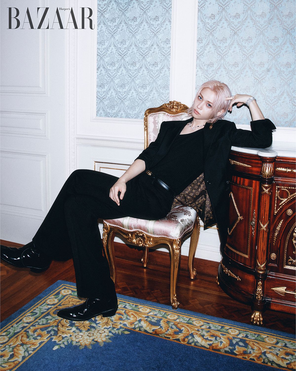 모노그램 모티프의 ‘미니 말’ 이어링, 다이아몬드와 오닉스가 조화를 이룬 ‘퓨어 V’ 링과 네크리스, V 형태로 포인트를 준 ‘퓨어 V 3D’ 브레이슬릿’, 재킷, 벨트는 모두 Louis Vuitton. 티셔츠, 팬츠, 슈즈는 스타일리스트 소장품.