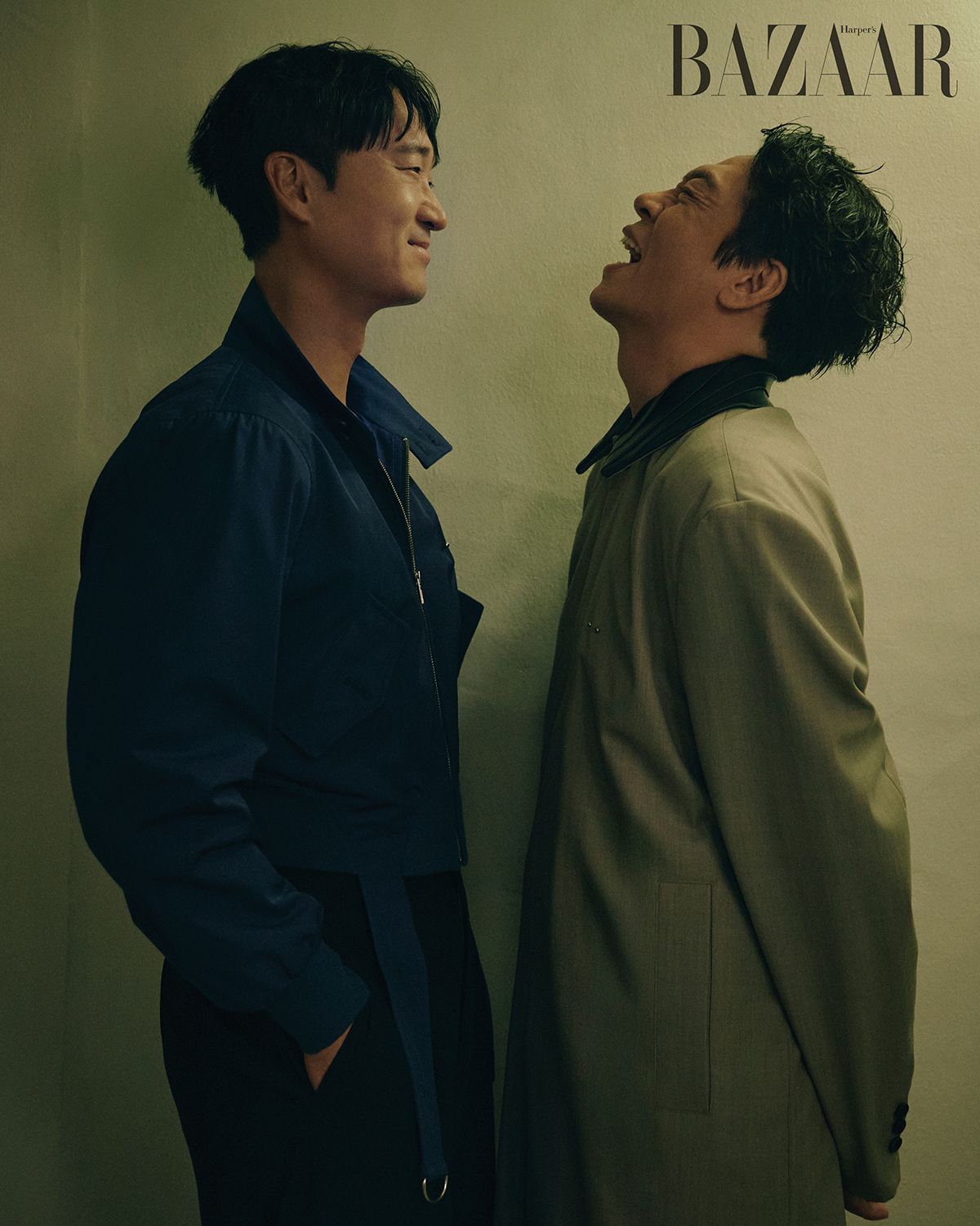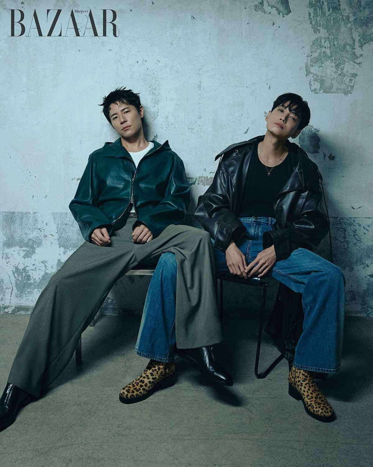 이규형이 착용한 재킷은 Ferragamo. 반지는 Chrome Hearts. 슈즈는 Ferragamo. 슬리브리스, 팬츠는 스타일리스트 소장품. 정경호가 착용한 코트는 Ych. 팬츠는 Levi’s. 슈즈는 Jimmy Choo. 목걸이는 아티스트 소장품. 슬리브리스는 스타일리스트 소장품.