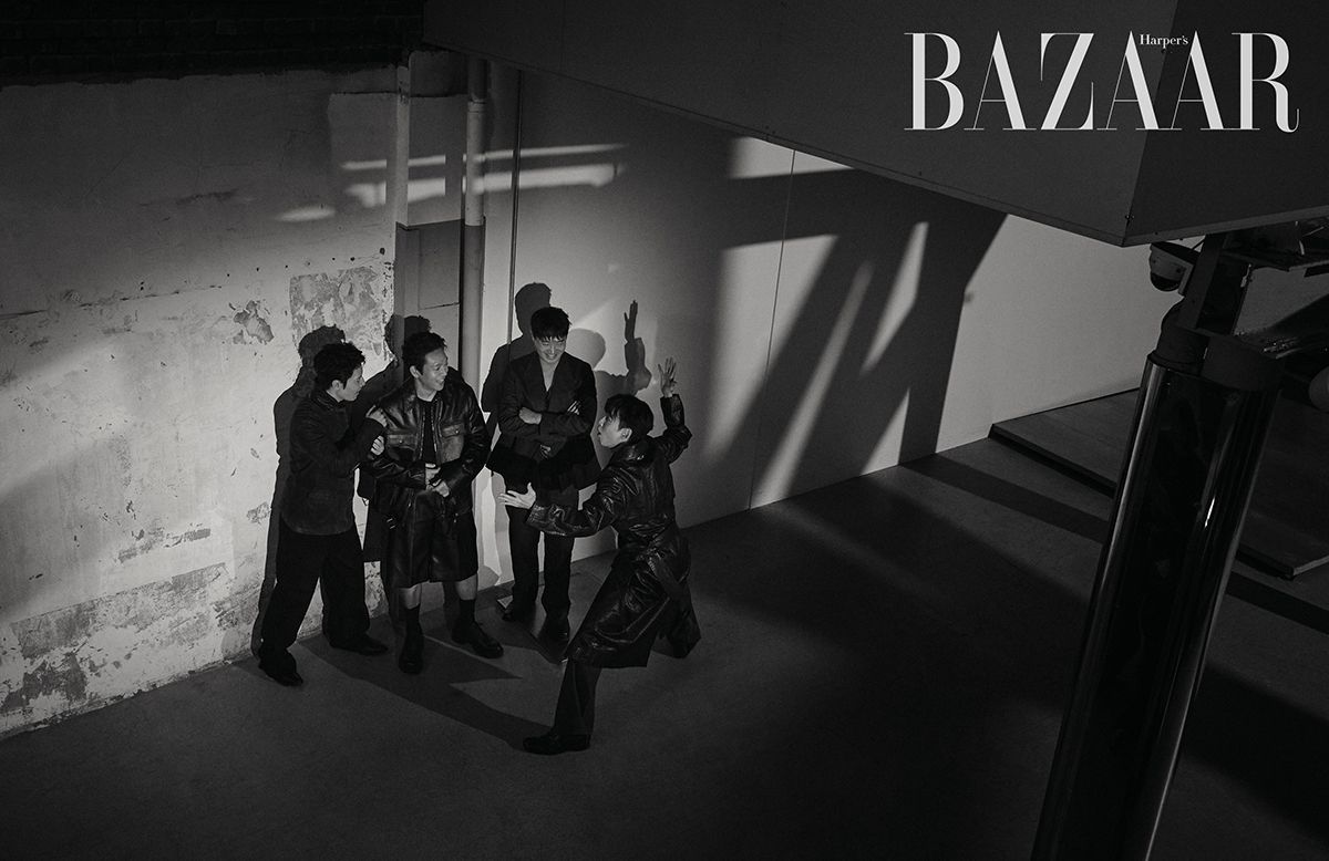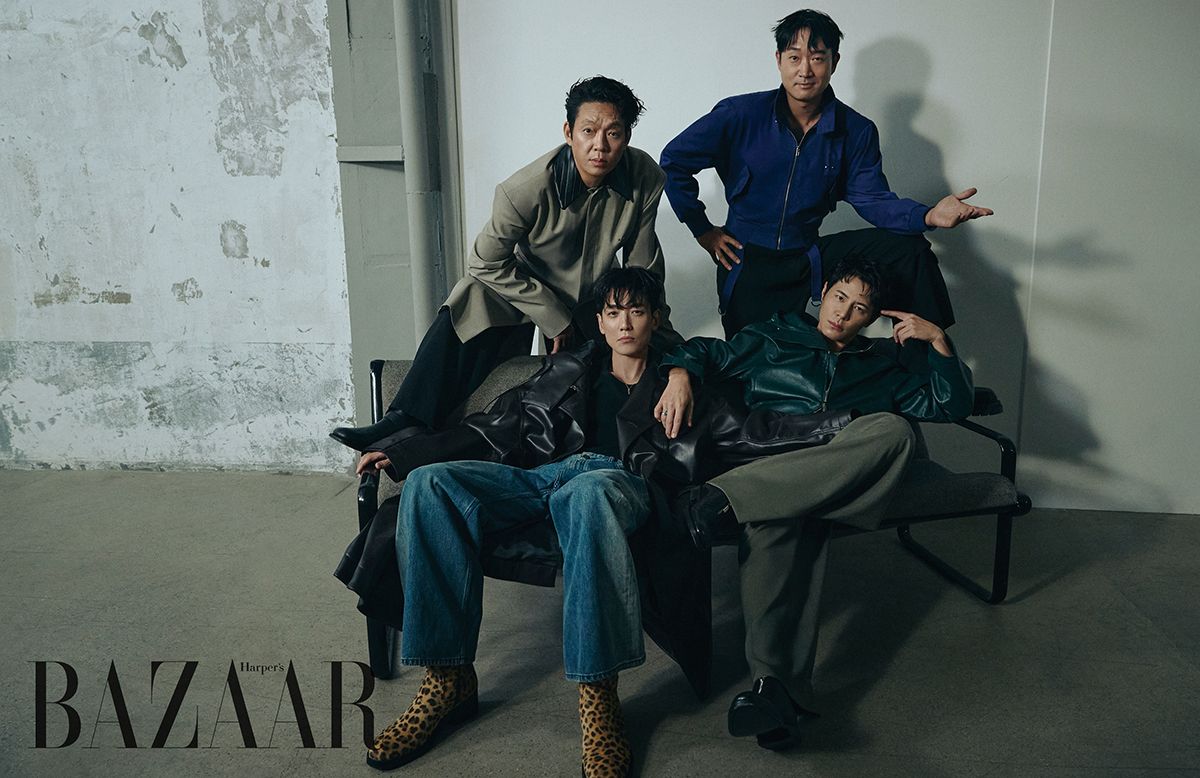박지환이 착용한 코트는 Bonbom. 팬츠는 Amomento. 슈즈는 Loewe. 정경호가 착용한 코트는 Ych. 팬츠는 Levi’s. 슈즈는 Jimmy Choo. 목걸이는 아티스트 소장품. 슬리브리스는 스타일리스트 소장품. 조우진이 착용한 재킷은 Bonbom. 팬츠는 Juun.J. 슈즈는 Bottega Veneta. 이규형이 착용한 재킷, 슈즈는 Ferragamo. 반지는 Chrome Hearts. 팬츠는 스타일리스트 소장품.