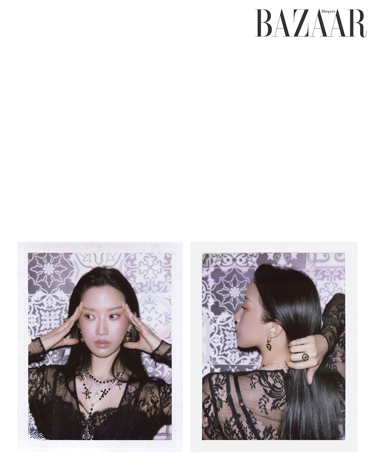 드롭 귀고리, 오른손 중지에 착용한 반지는 ‘트레디션’ 컬렉션, 다양한 참 장식이 돋보이는 목걸이, 레이어드한 십자가 장식 드롭 목걸이, 왼손 검지에 착용한 반지는 ‘데보션’ 컬렉션, 레이스 드레스는 8백25만원 모두 Dolce & Gabbana.