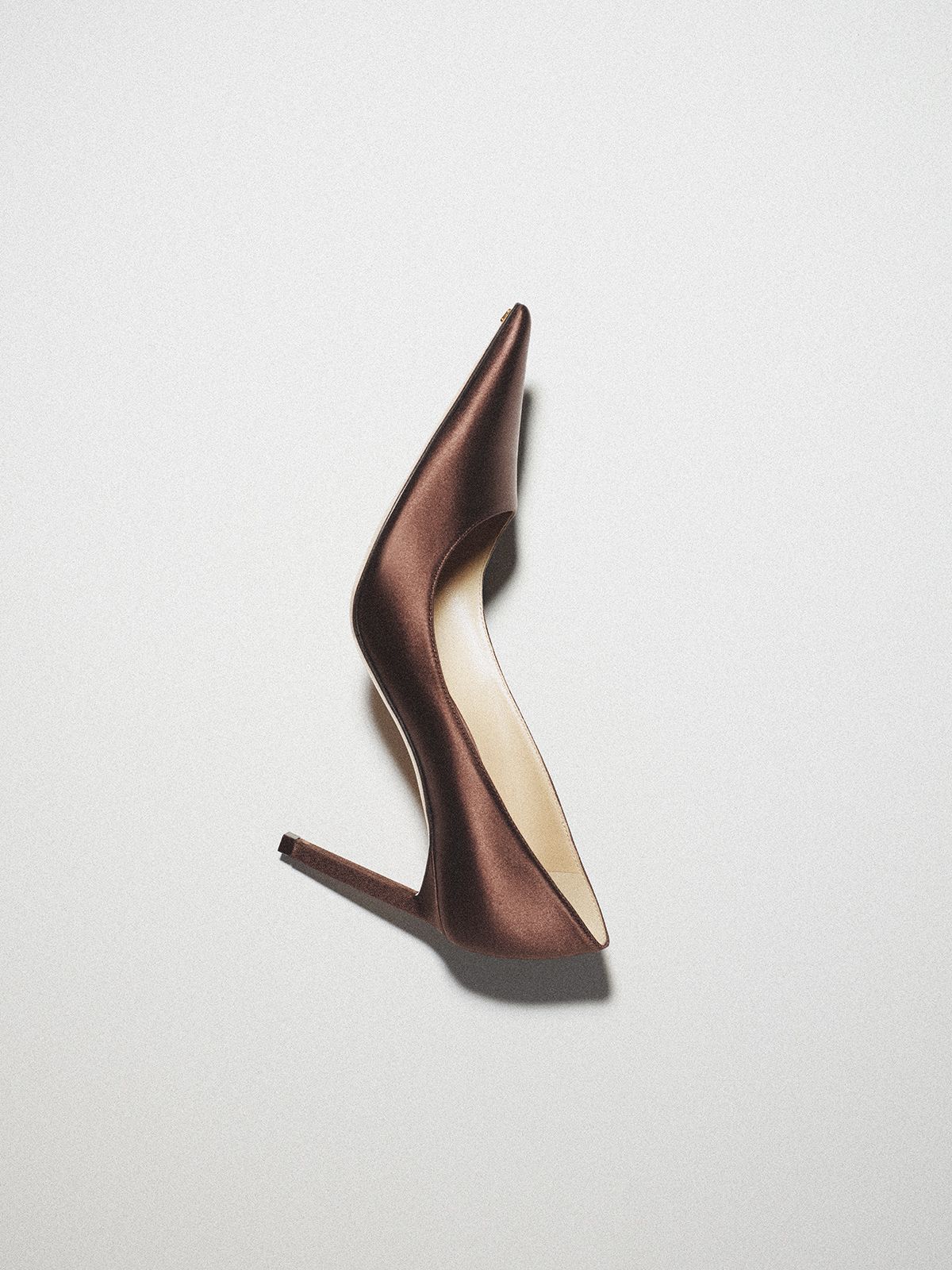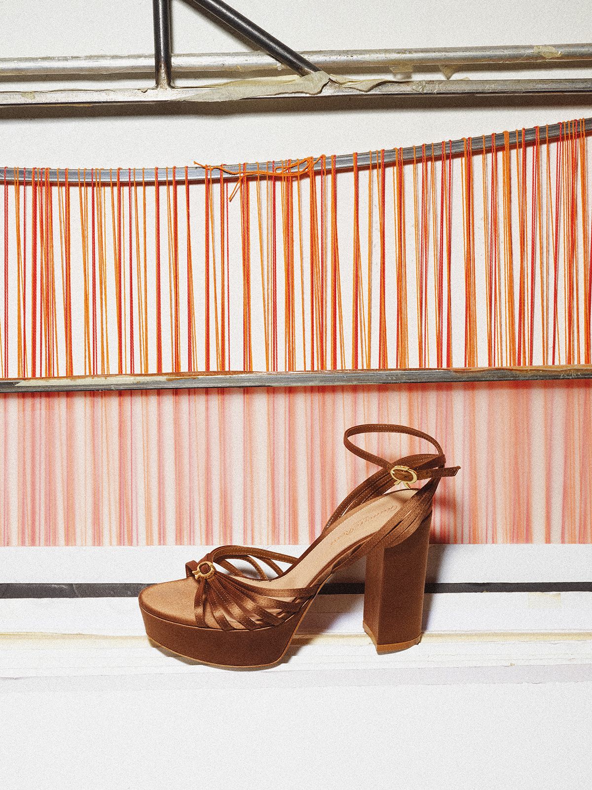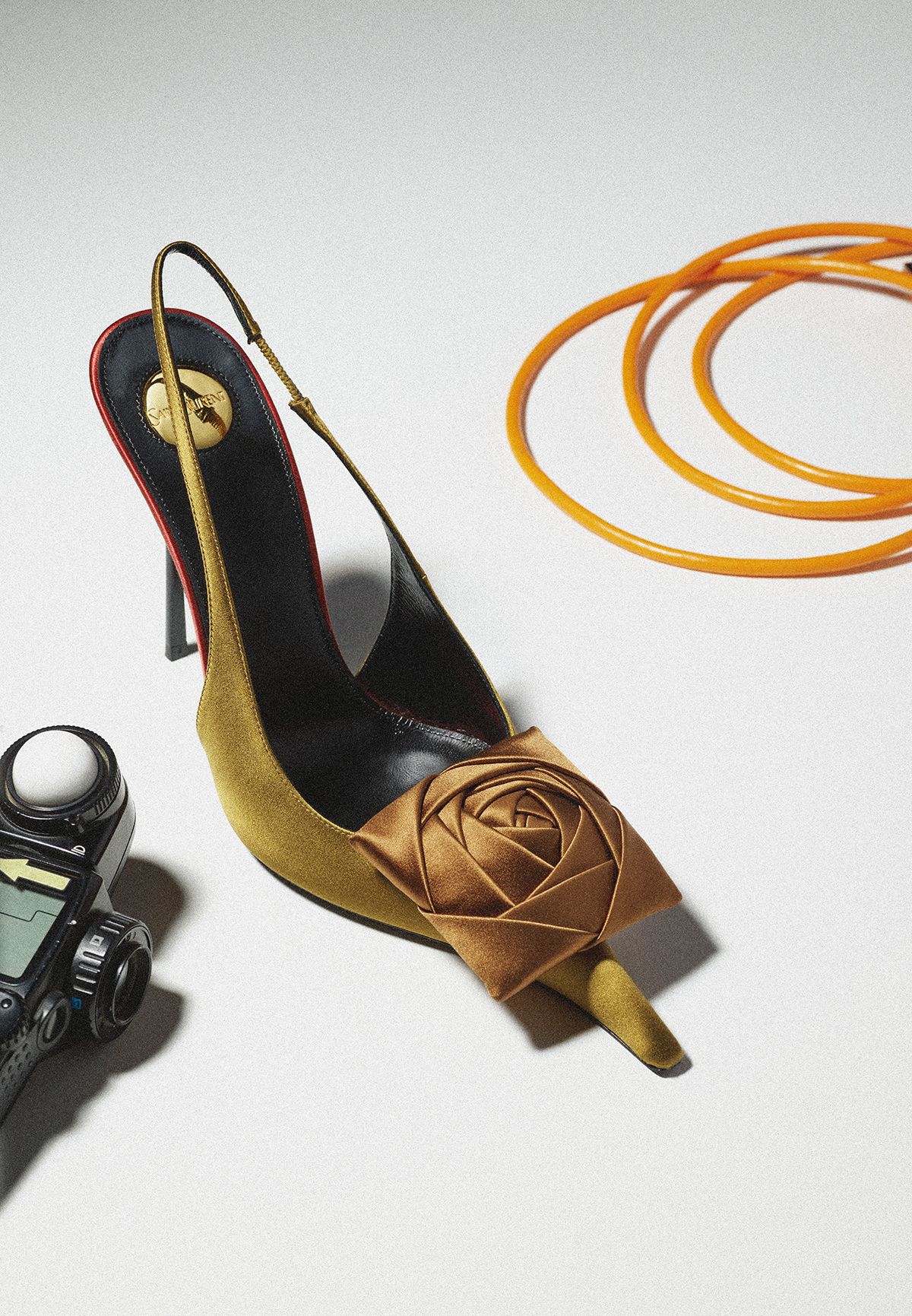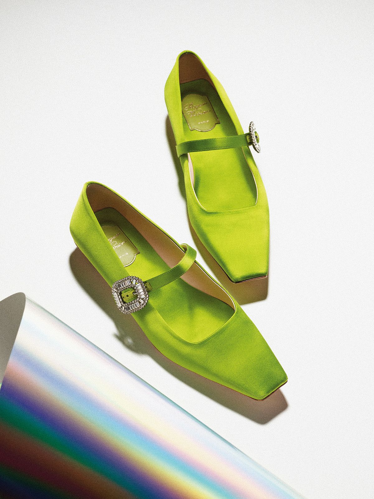 발끝에서 번지는 빛으로 룩 전체에 화려한 무드를 불어넣는 컬러풀한 새틴 슈즈.