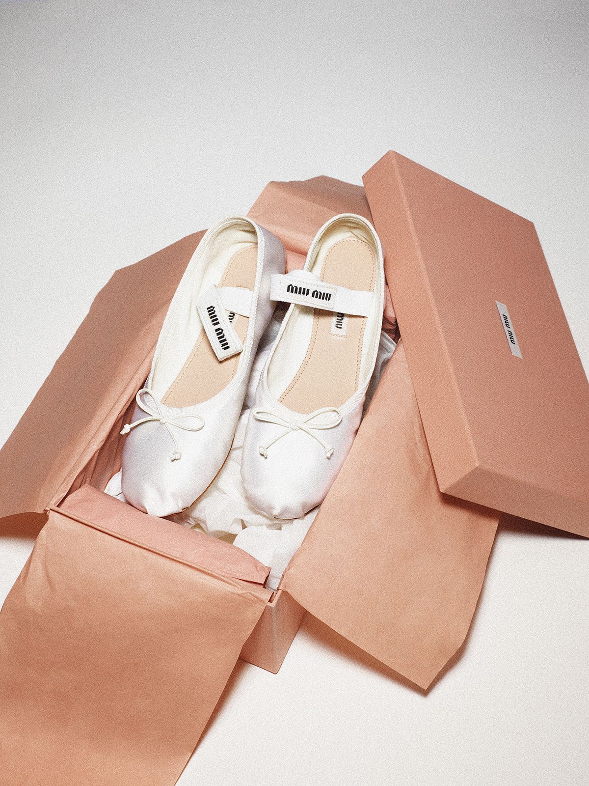 로고 장식 밴드가 돋보이는 발레리나 슈즈는 1백42만원 Miu Miu.