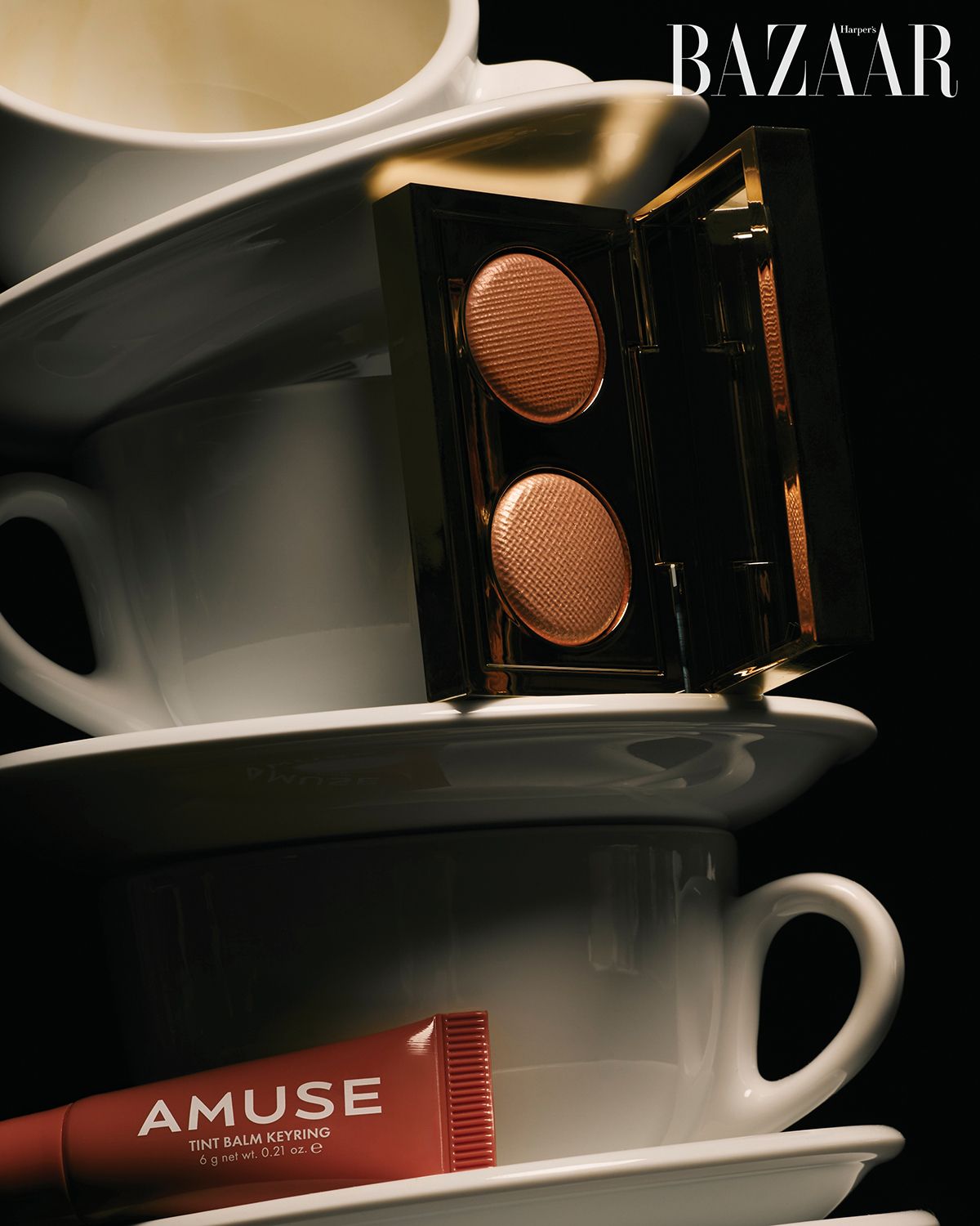 다 비운 카페라테 잔 사이에 놓인 제품은 테라코타와 웜 코퍼 컬러를 담은 Bobbi Brown 럭스 아이섀도우 듀오, 스파클링 진저 7만4천원대. 코코넛 모카 컬러의 틴트 밤을 키링으로 만든 Amuse 틴트 밤 키링, 08 넛 모카 1만5천원.