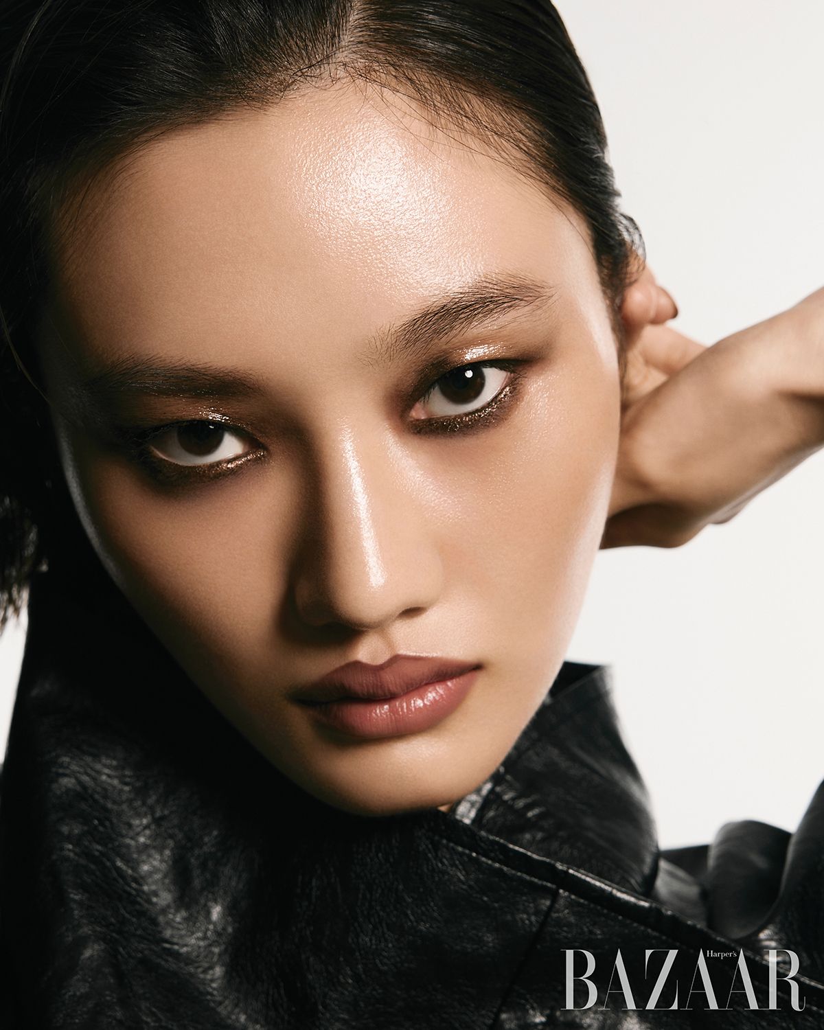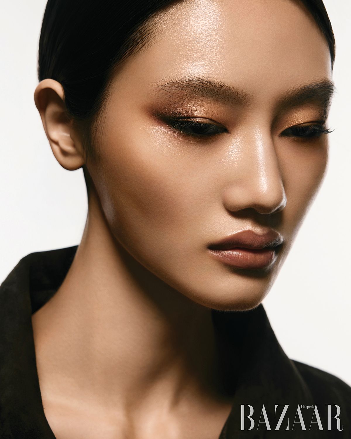 에스프레소의 깊고 농밀한 에센스를 브라운과 블랙의 글로시 텍스처로 풀어냈다. 샤넬 ‘스틸로 옹브르 에 꽁뚜아’ 12 꽁뚜아 클레어를 눈두덩 전체에 펴 바르고, 바비 브라운 ‘롱웨어 크림 섀도우 & 콜 라이너’ 퓨터/블랙 벨벳을 믹스해 언더라인과 눈두덩에 번지듯 연출했다. 여기에 투명 글로스를 얹어 윤기 있는 아이 룩을 완성했다. 입술엔 누드 브라운 컬러인 샹테카이 ‘립 크렘’ 뱀부를 입히고, 바비 브라운 ‘립 펜슬’ 코코아로 입술산을 강조했다. 샬롯틸버리 ‘할리우드 뷰티 라이트 완드’ 스포트라이트와 샤넬 ‘바움 에쌍씨엘 글로우 스틱’ 트렌스페어런트를 광대뼈와 턱 끝에 터치해 커피 원두처럼 은은한 윤광을 표현했다.