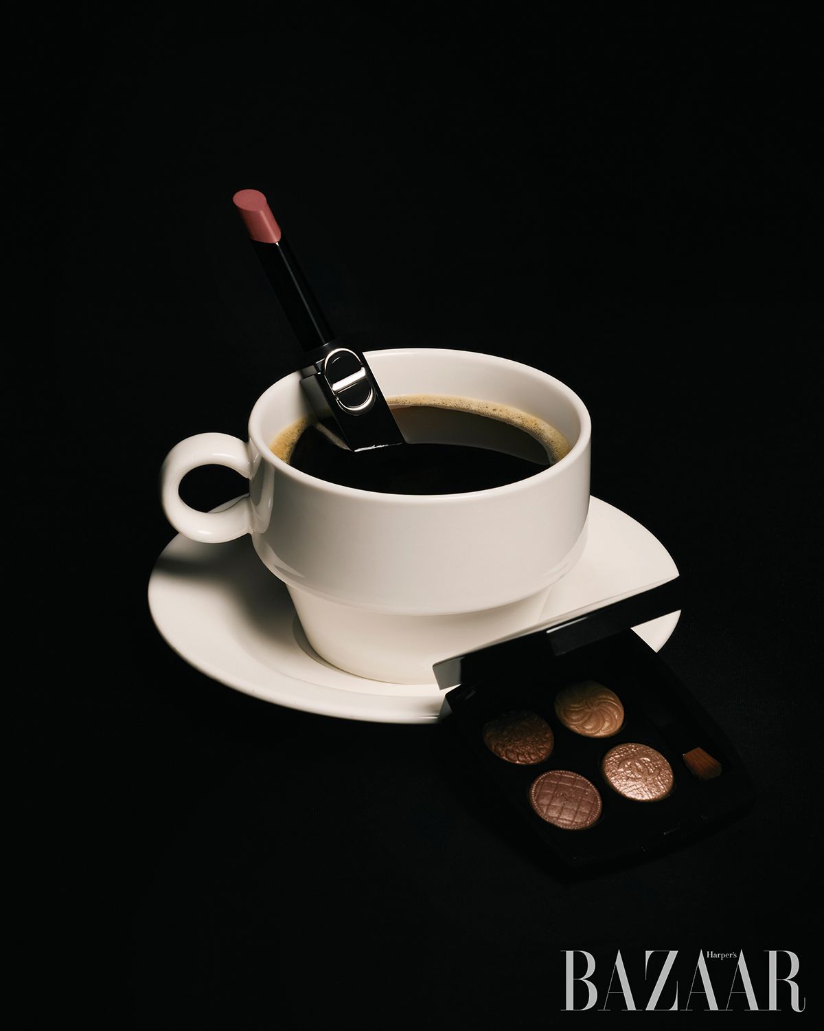 아메리카노 안에 담긴 제품은 누드 베이지 컬러의 Dior 루즈 디올 온 스테이지, #222 컨피던트 누드 5만9천원대. 브라운, 토프, 베이지 컬러로 구성된 아이섀도 팔레트는 Chanel 레 꺄트르 옹브르 버튼, 꾸뛰르 11만5천원.