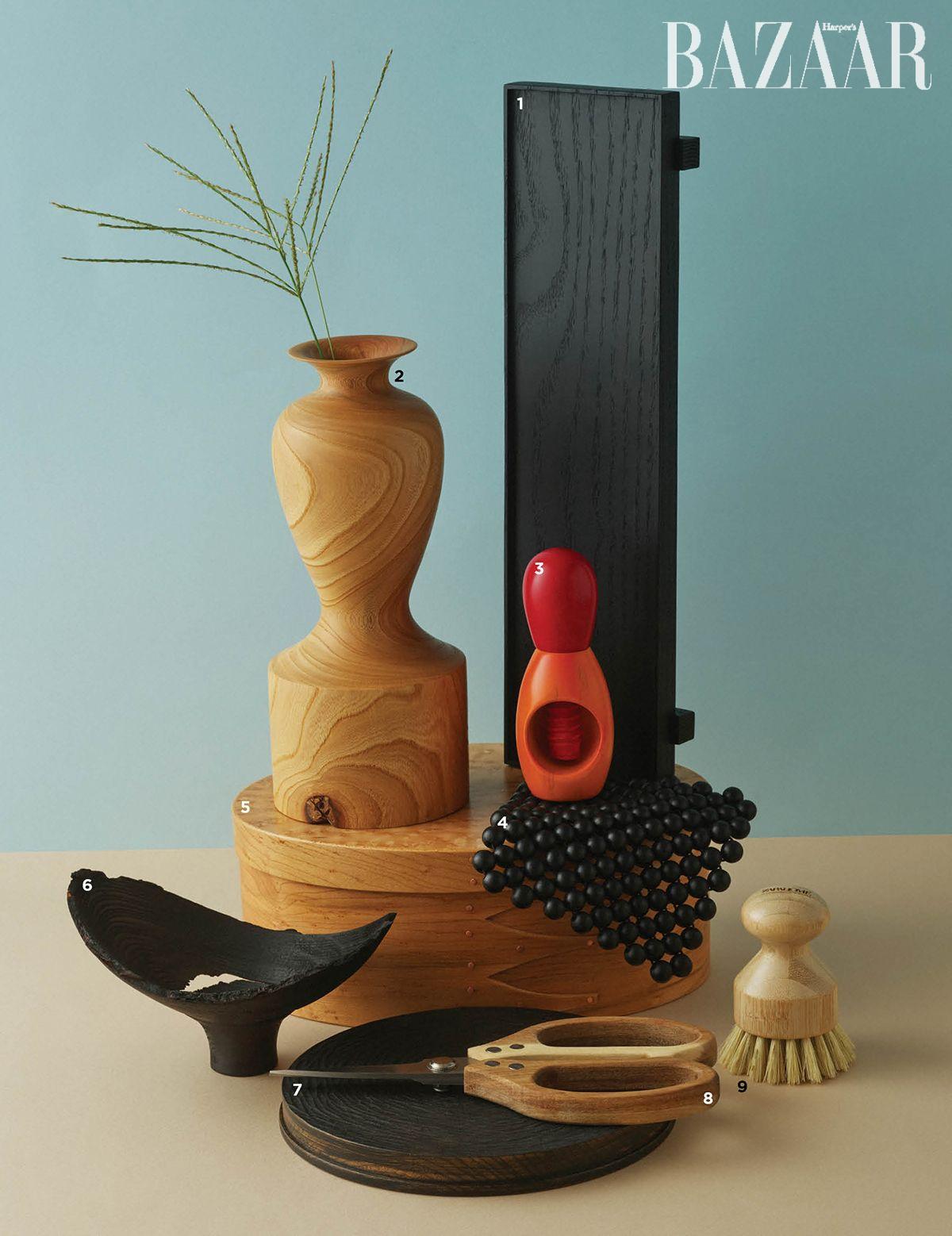 1 다도에 활용할 수 있는 좁고 긴 직사각 형태의 트레이는 19만원 Studio Deete by Objectify. 2, 6 깊이가 얕은 화병 형태의 나무 오브제는 75만원, 자연스럽게 생긴 나무의 결 사이 갈라진 틈을 살린 볼은 29만원 Yenuha. 3 둥근 손잡이를 돌려 견과류의 단단한 껍질을 부술 수 있는 크래커는 4만4천원 Manzoni Pietro by Informalware. 4 액세서리나 식기류를 올려둘 수 있는 우든 코스터는 4만3천원 Tta. 5 시간이 지날수록 붉은빛이 짙어지는 체리 우드 소재의 셰이커 박스는 13만원대 Brent Rourke by Informalware. 7 잔잔한 파도를 형상화한 물결 무늬의 원형 플레이트는 15만원 Tiamtree by Objectify. 8, 9 큼지막한 나무 손잡이가 달린 주방용 가위는 5만5천원대, 한 손에 쏙 감기는 형태의 대나무 브러시는 1만원대 Zara Home.