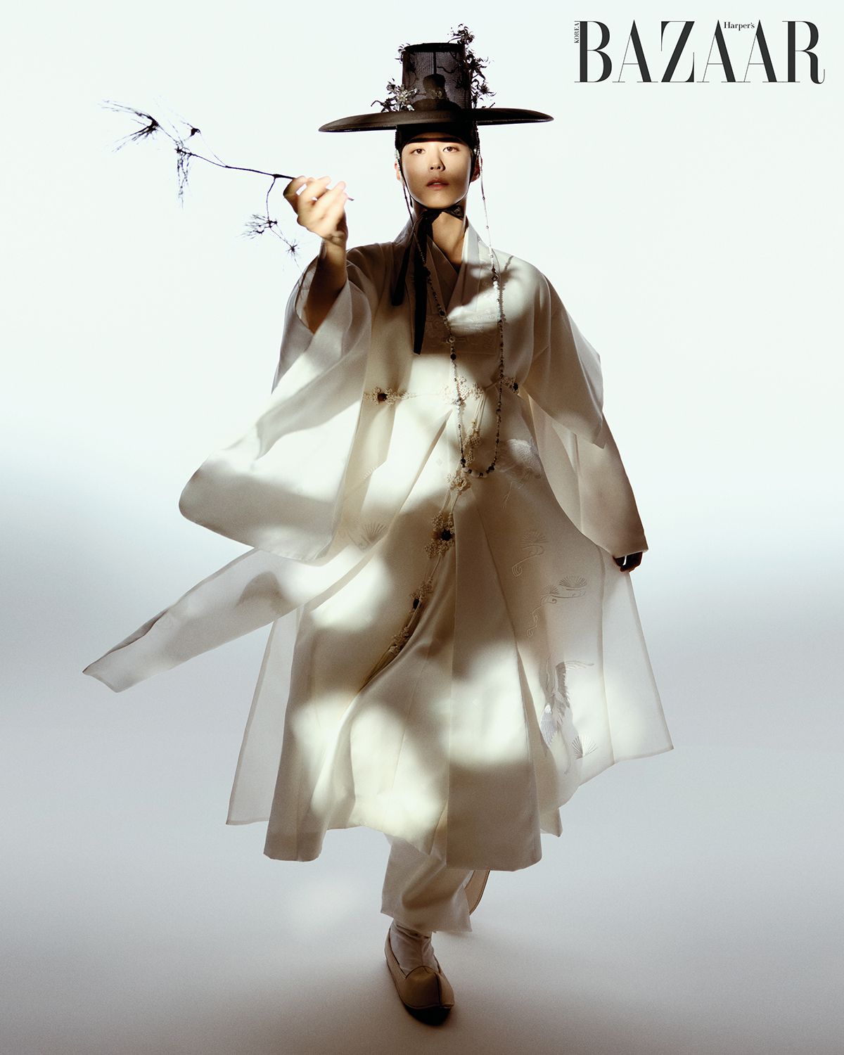 답호, 두루마기, 바지, 상투관, 망건, 망건에 단 관자, 허리에 두른 세조대는 모두 Mooroots,. 갓은 Q Millinery. 갓끈은 Maison De Yoon.