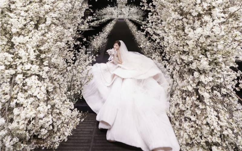 본식에서는 넥라인을 완전히 덮은 하이넥 디자인의 심플한 드레스를 선택했다. 군더더기 없는 실루엣 속에서 고급스러운 소재감과 완벽한 핏이 돋보였고 유행보다 자신만의 미니멀한 감성을 우선시한 김나영다운 선택이었다.