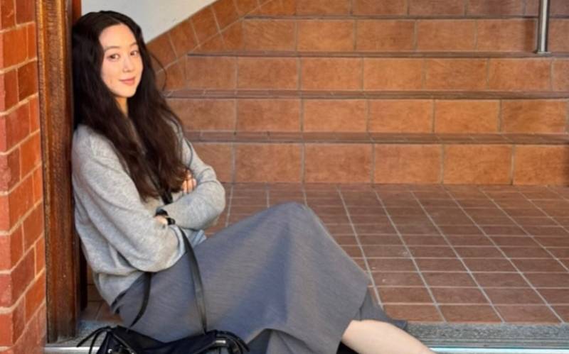 그레이 니트 가디건, 어그와 함께 와이드 데님 팬츠를 착용한 지수 @sooyaaa__
