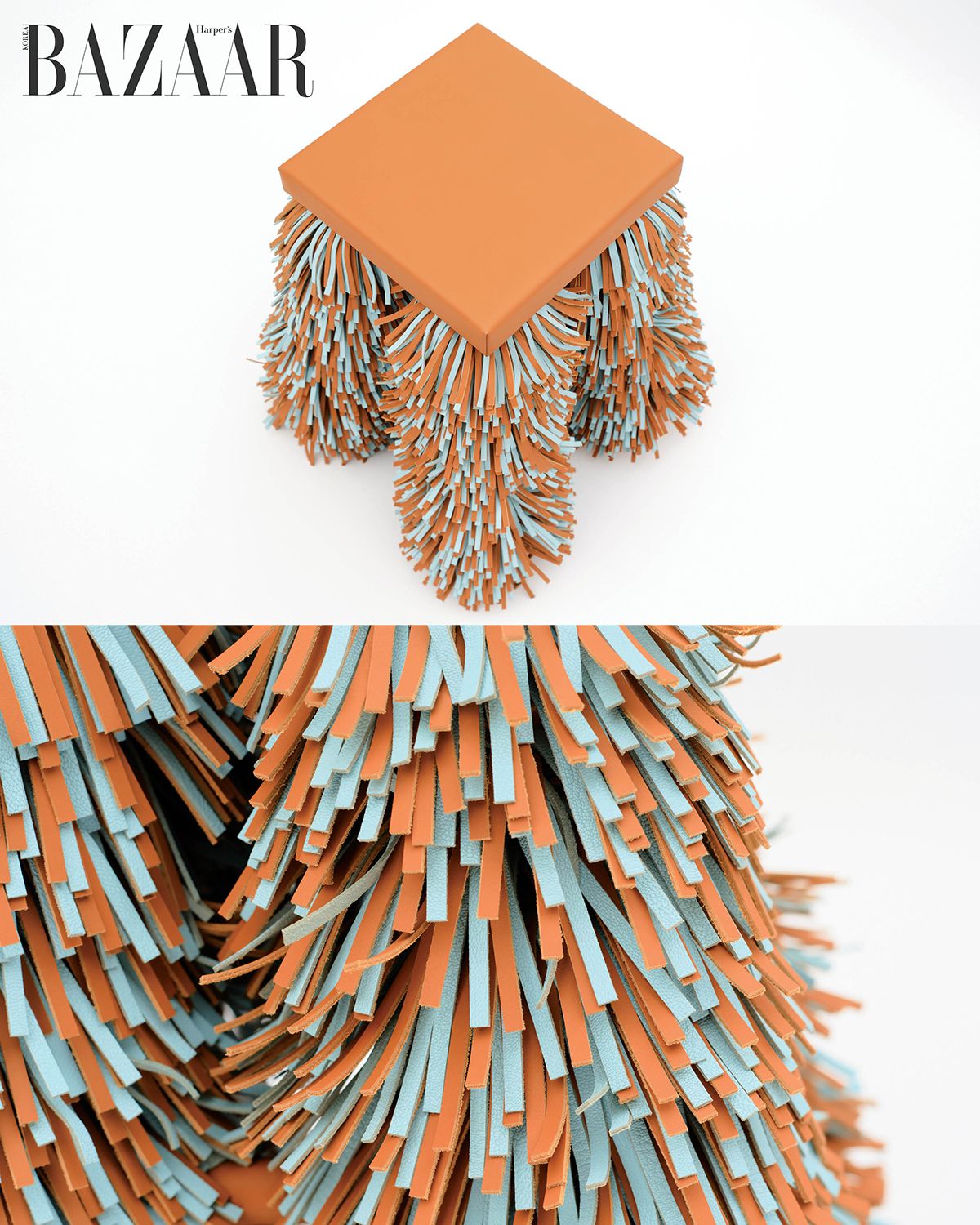 카프스킨 소재의 프린지 스툴은 Hermès.