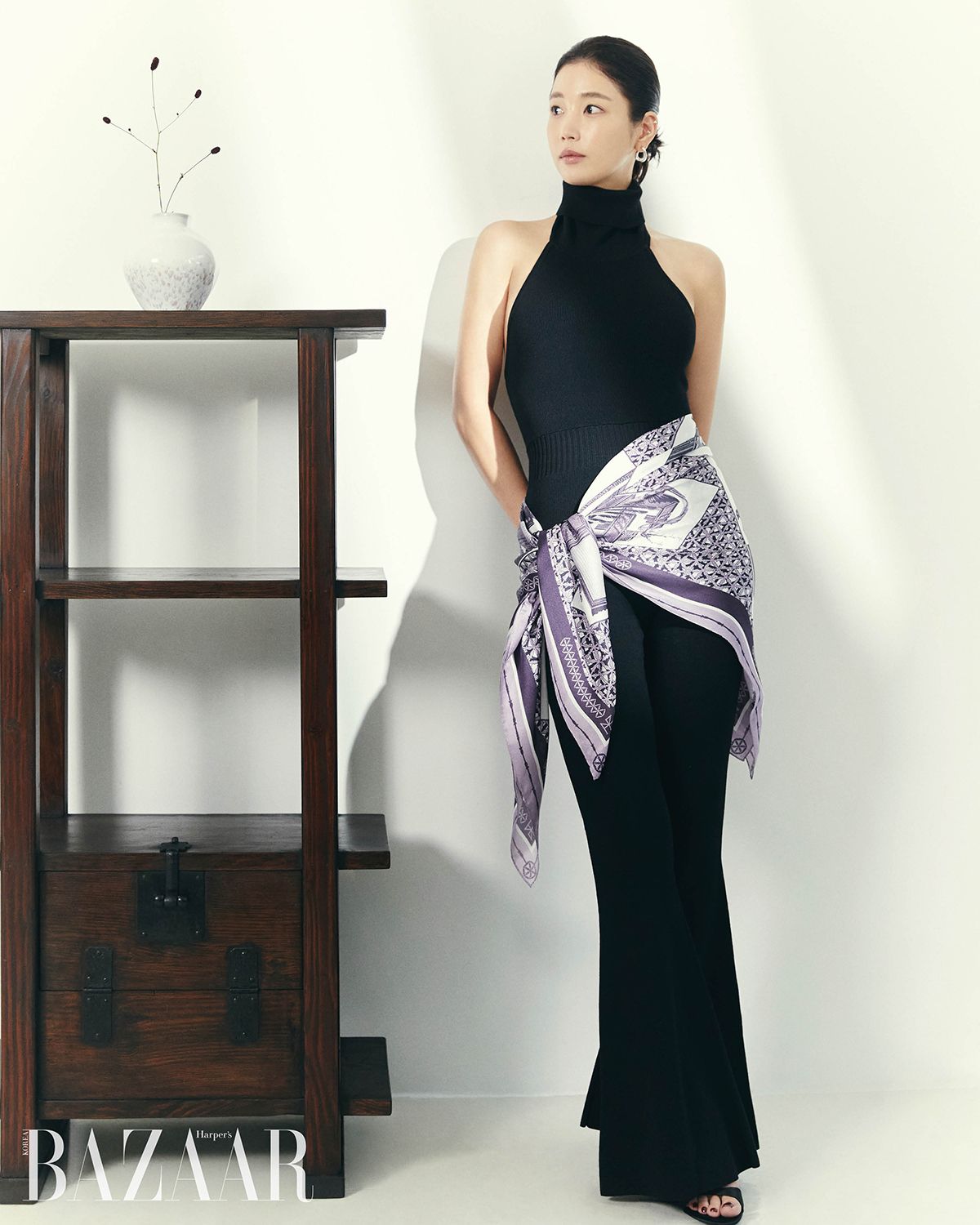 머리에 두른 실크 트윌 소재의 ‘도자기’ 스퀘어 스카프는 25만원 HYE.