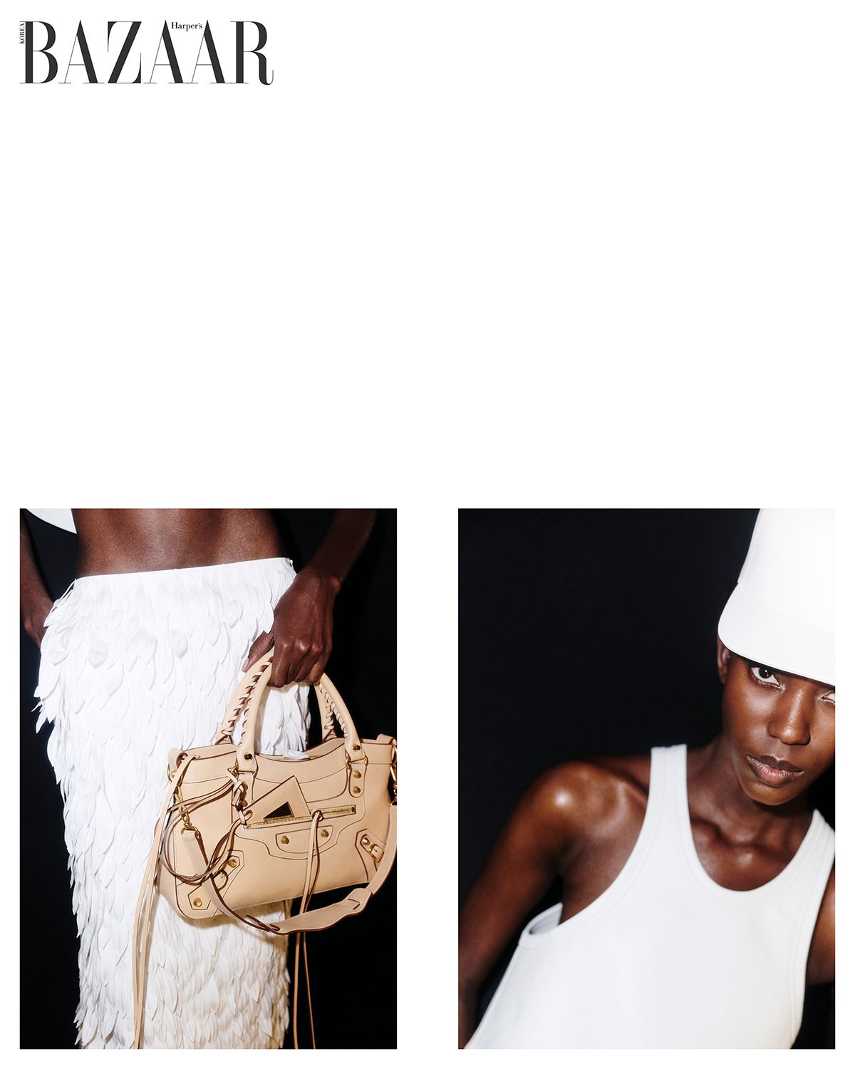 블랙 레더 소재 벌룬 디테일의 발렌시아가 미니 드레스를 입은 노윤서가 뉴 시즌 백을 들고 포즈를 취하는 순간.