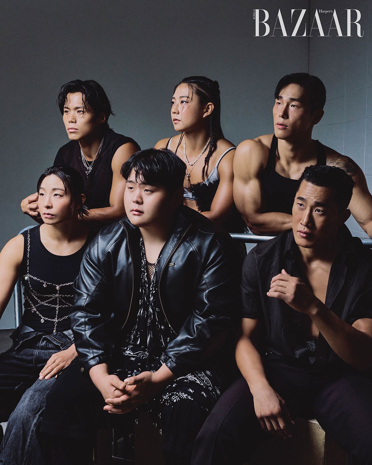 (왼쪽부터) 김동현이 착용한 톱, 팬츠는 Fendi. 체인은 Toga Virilis. 장은실이 착용한 원피스는 Loewe. 레이어드한 체인 톱은 Q Millinery. 팬츠는 Avavav. 팔찌는 Bulletto. 김민재가 착용한 아우터는 Ajobyajo. 톱, 벨트는 Lemeteque. 팬츠는 Juun.J. 슈즈는 Givenchy. 스카프는 스타일리스트 소장품. 최승연이 착용한 톱은 Haag. 레이어드한 톱은 Jose Moon. 팬츠는 Amiri. 슈즈는 Christian Louboutin. 목걸이는 Cos, Bulletto. 아모띠가 착용한 톱은 Helmut Lang. 팬츠는 Loewe. 모자는 Eric Javits. 벨트는 Bell&Nouveau. 목걸이는 Chrome Hearts, Bell&Nouvea. 슈즈는 Christian Louboutin. 윤성빈이 착용한 아우터, 팬츠는 Moncler × A$AP Rocky. 벨트는 Dries Van Noten. 톱, 체인, 슈즈는 스타일리스트 소장품.