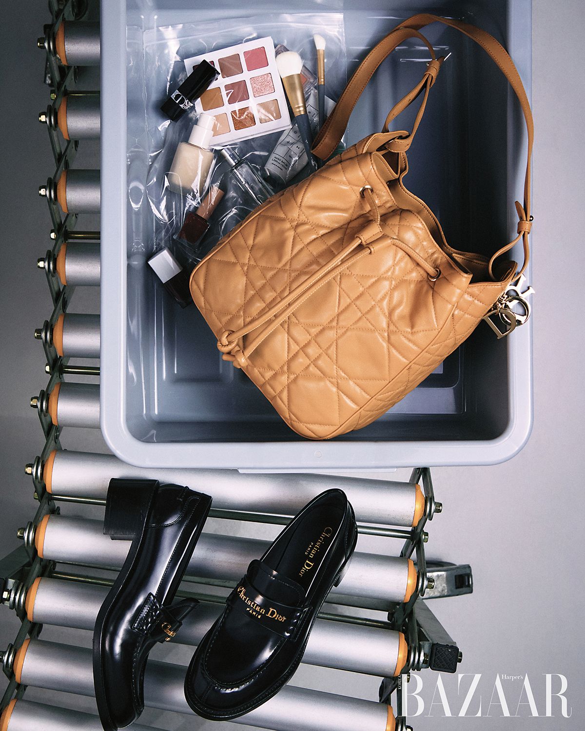 베이지색 가죽에 까나쥬 패턴을 새긴 ‘디 모션’ 백, 로고 장식의 ‘보이’ 로퍼는 Dior.