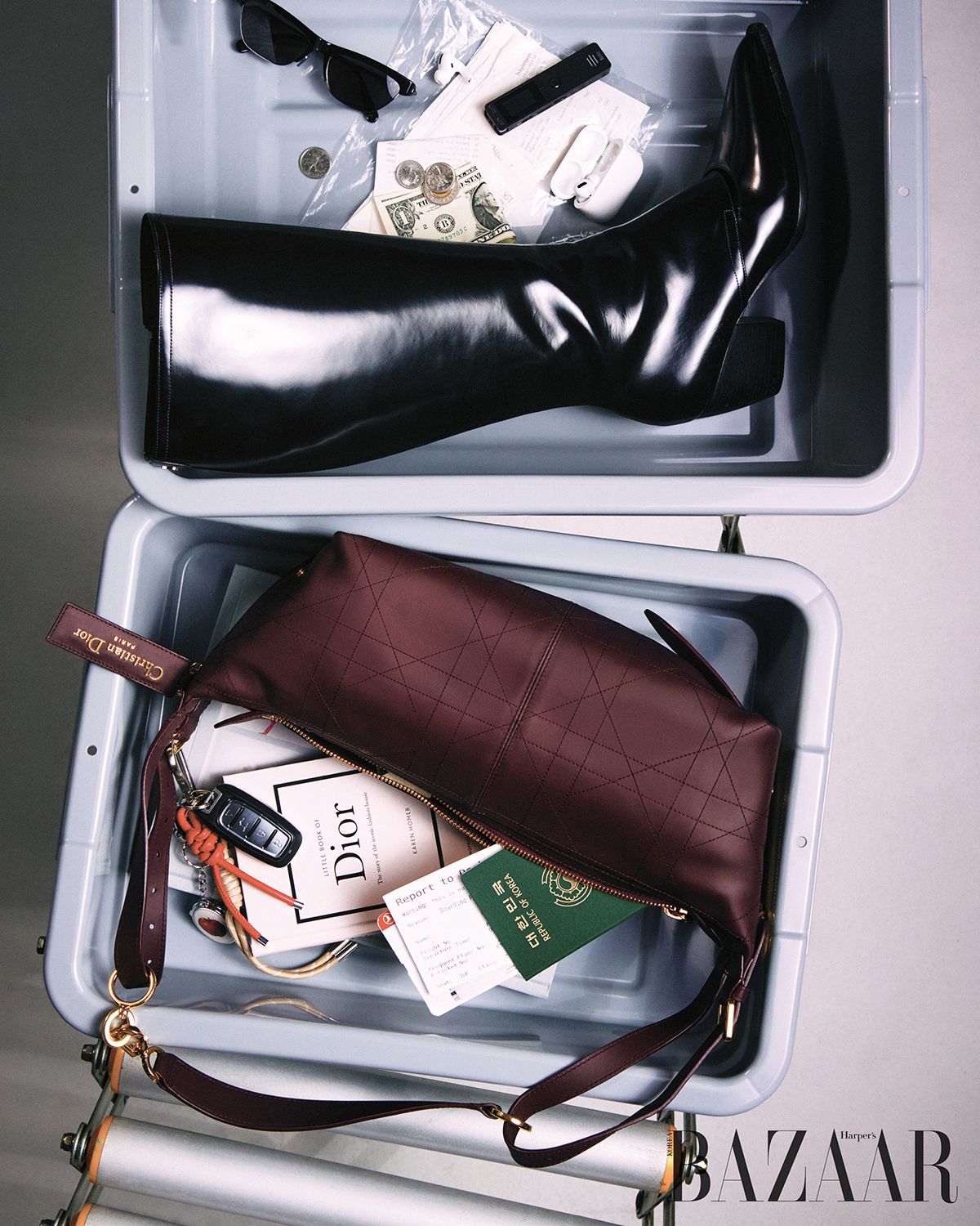 앙증맞은 사이즈의 ‘카로’ 백, 까나쥬 패브릭과 가죽이 어우러진 ‘디 타운’ 부츠는 Dior.