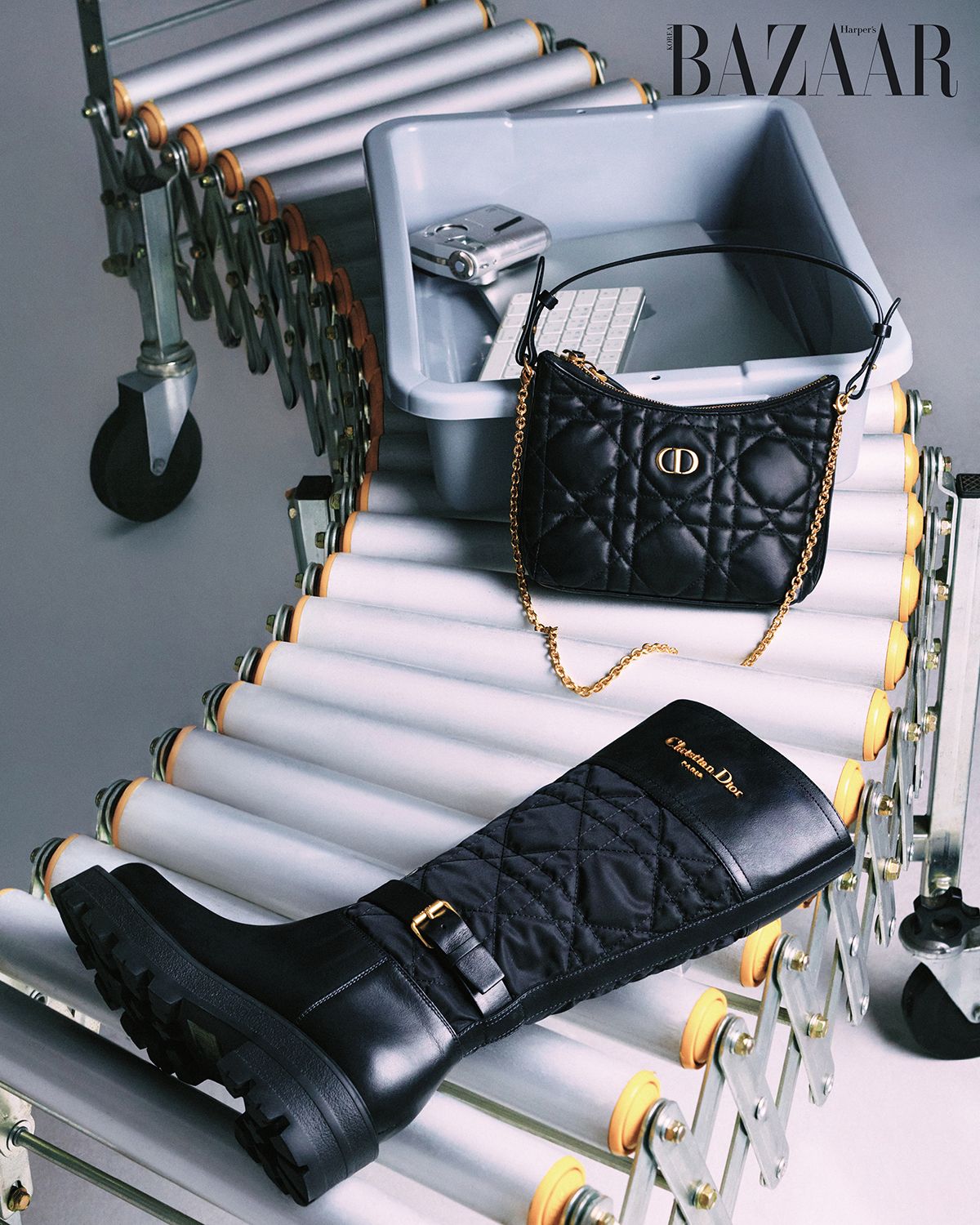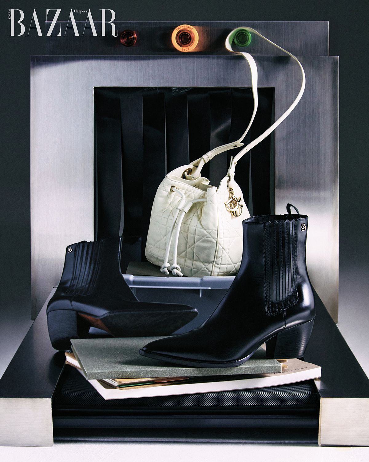 로고 자카드 소재의 ‘디 드림’ 미니 백, 이그조틱한 가죽이 돋보이는 ‘센추리’ 부츠는 Dior.
