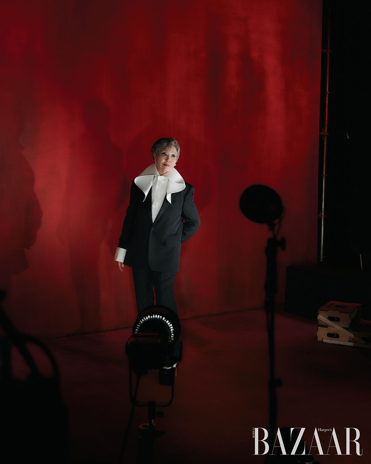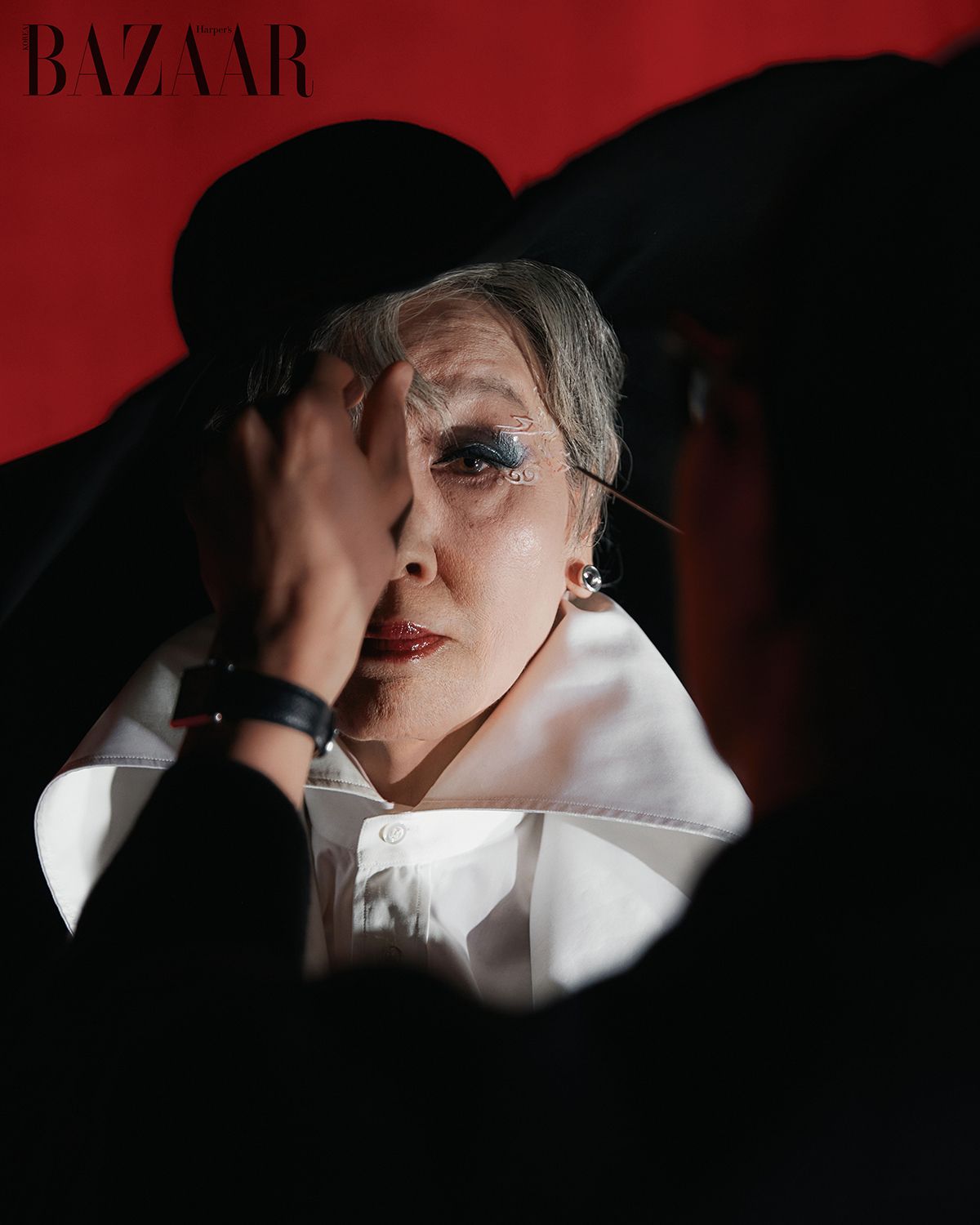민 킴 한국적인 요소를 고민하던 중 자개가 떠올라 시장조사를 나갔어요. 그러다 우연히 어떤 두 분의 대화를 들었는데, 어느 자개가 50년이 넘은 거라고 하더라고요. 그 순간 반세기 넘게 연기 생활을 하신 선생님이 떠올랐어요. 오랜 시간이 켜켜이 쌓여 있다는 점이 맞닿아 있었고, 그 세월의 층위를 얼굴 위에 옮겨 담고 싶었어요.