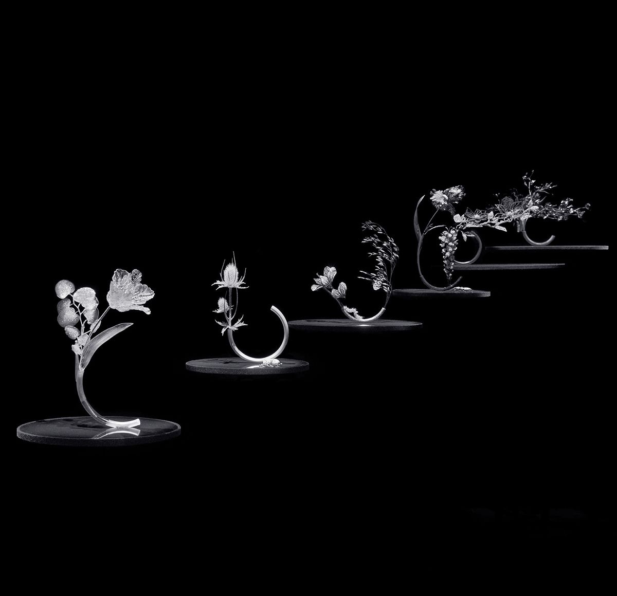 지난 파리 오트 쿠튀르 기간 공개된 2025 까르뜨 블랑슈 하이주얼리 ‘임퍼머넌스(Impermanence)’ 컬렉션이 여러 도시를 거쳐 서울에 상륙했다. 사방에 고요한 어둠이 깔린 행사장에 들어서자, 중간에 자리한 여섯 개의 컴포지션이 모든 프레스의 시선을 압도했다. 우선 (주얼리치고는) 예상보다 큰 크기가 마치 갤러리에 놓인 작품인 양 착각을 부른다. 가장 밝은 ‘Composition N°6’부터 시작해 완전한 어둠을 지닌 ‘Composition N°1’까지 차례로 놓여 있다. “사라지기 전의 자연의 아름다움을 담아내고자 했습니다. 여섯 개의 구성은 빛에서 어둠으로 이어지며, 자연이 얼마나 소중한지를 이야기합니다. 이 컬렉션은 금방 부서져버리는 순간을 영원히 새기고 싶었던, 덧없는 찰나에 대한 경의의 오마주입니다.” 이번 시즌 클레어 슈완은 2018년 선보인 하이주얼리 이터널 플라워(Eternal Flowers)로 시작된 ‘덧없는 것을 영원하게 만들고자 했던’ 창조적 여정을 이어 나갔다. 영감의 원천은 일본 꽃꽂이 예술인 이케바나