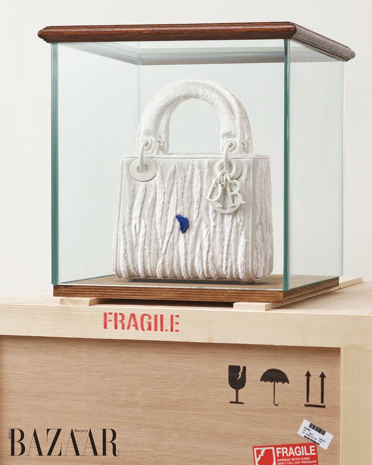 세 가지 버전으로 완성한 작품은 그의 회화·조각이 지닌 절제의 미학과 여백의 사유를 그대로 품고 있다. 인조 퍼로 덮인 백은 스치기만 해도 느껴지는 따뜻한 질감으로 존재의 흔적을 남기고, 미니어처 프린지로 장식한 백은 공기 중 리듬을 시각화한다. 마지막 버전은 가죽 위에 섬세하게 자수를 수놓아 매혹적인 입체감을 완성한다. 각각 블랙, 블루, 화이트의 모노크롬 컬러 위에 단 한 번의 붓질이 더해진 형태는 대번에 그의 회화를 연상케 한다. 붓 자국은 물질성 그 자체를 드러내지만 정작 시선은 남지 않은 여백으로 향한다. 작가의 최소한의 개입 속에 정적과 운동, 표면과 제스처, 공간과 존재가 그 한 획 안에서 호흡한다. 이우환의 레이디 디올은 그렇게 비움이 만들어내는 울림, 사물과 인간이 맺는 관계의 철학을 이야기했다.