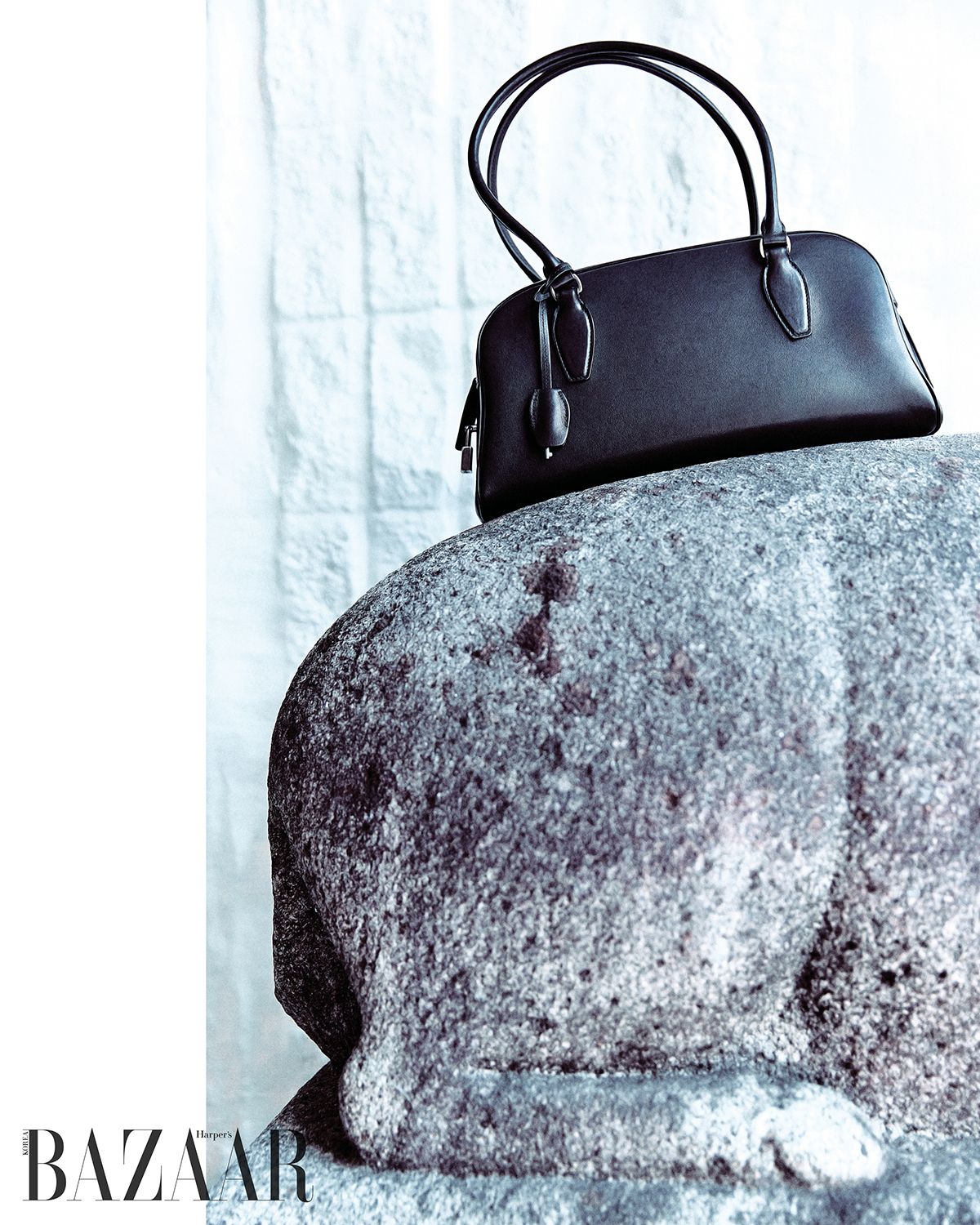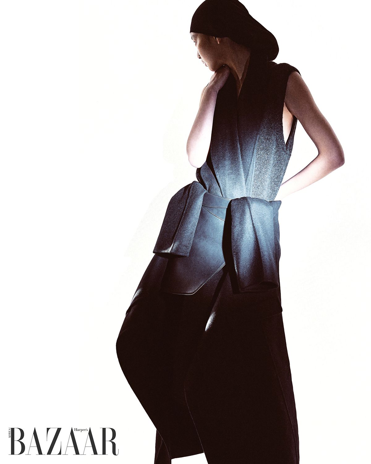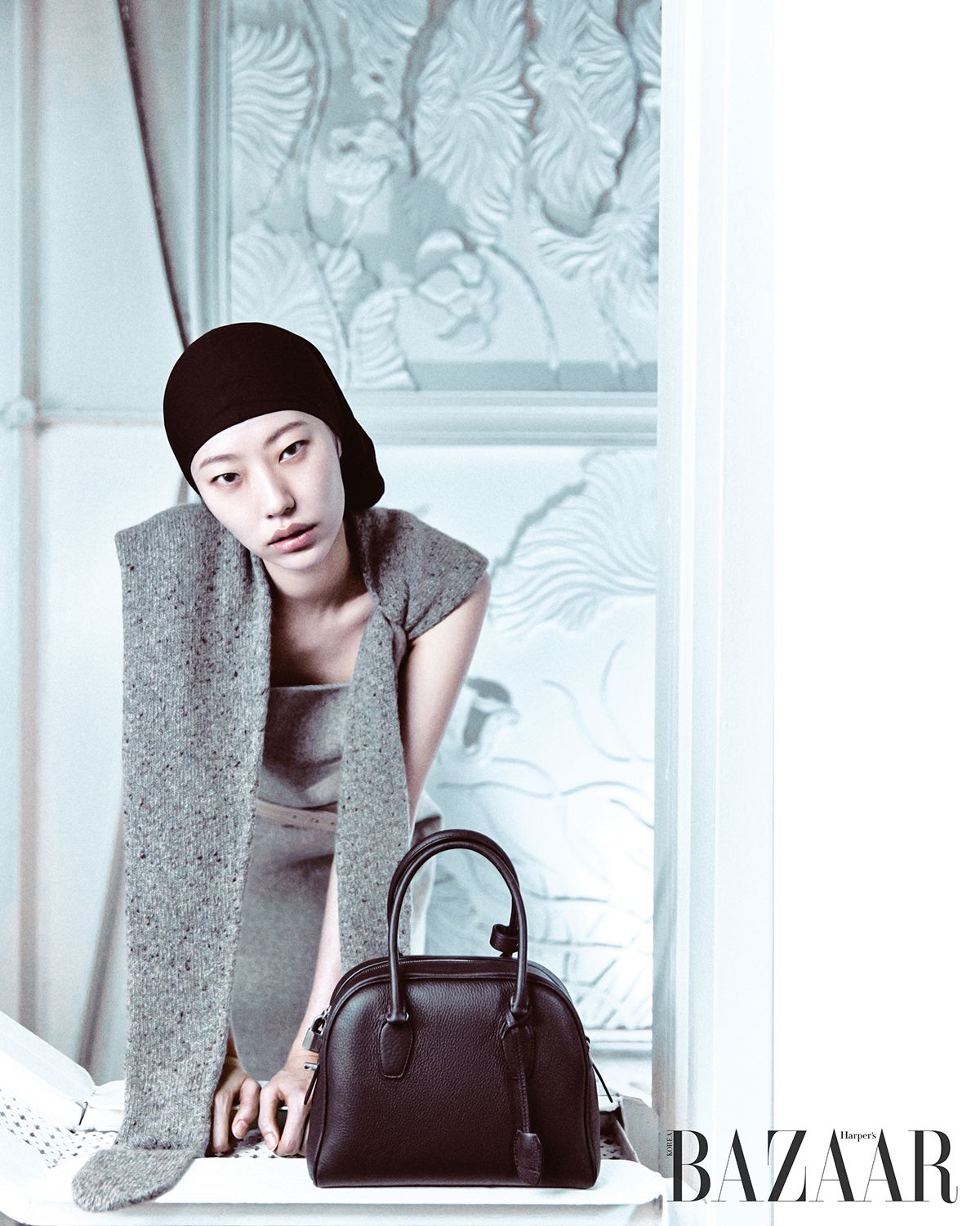 ‘바디라(Vadira)’ 울 드레스, ‘디온’ 모자, 숄로 연출한 ‘무무카(Mumuka)’ 타이츠, ‘인디아(India) 10.00’ 백은 모두 The Row.